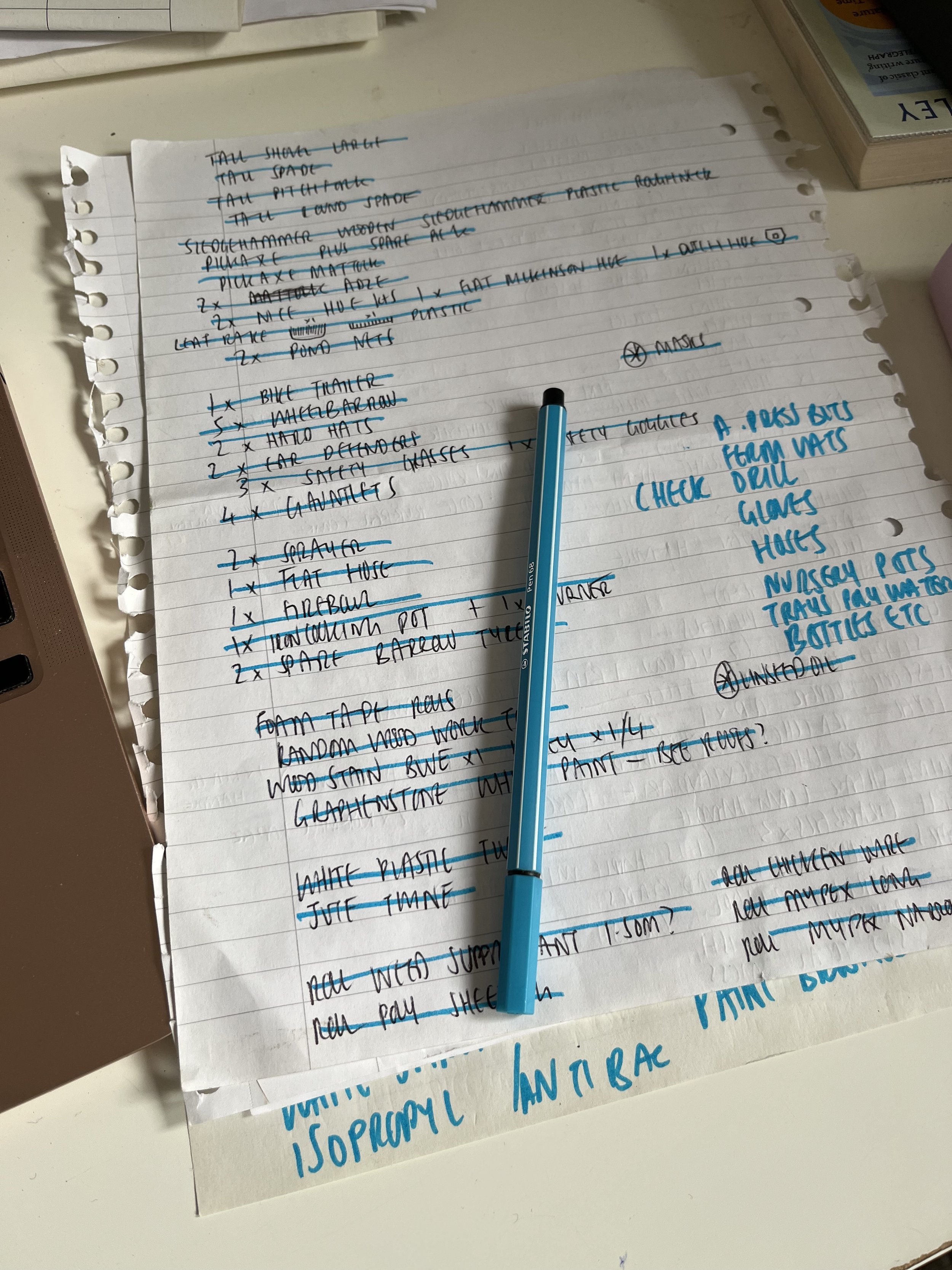 Images: 1. Shelves for easily accessible first aid kits in the shed; 2. What do you even call this tool? Originally I'd noted it as the shears that look like a stork...; 3. Handwritten tool audit with crossings for when the digital spreadsheet was updated.