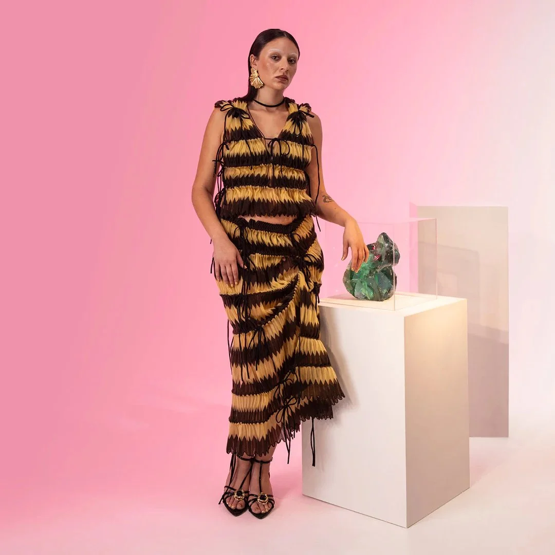 Chevron Pleated Vest + Skirt from Alexandra Larrabure — a modular adjustable knit party using deadstock yarn.