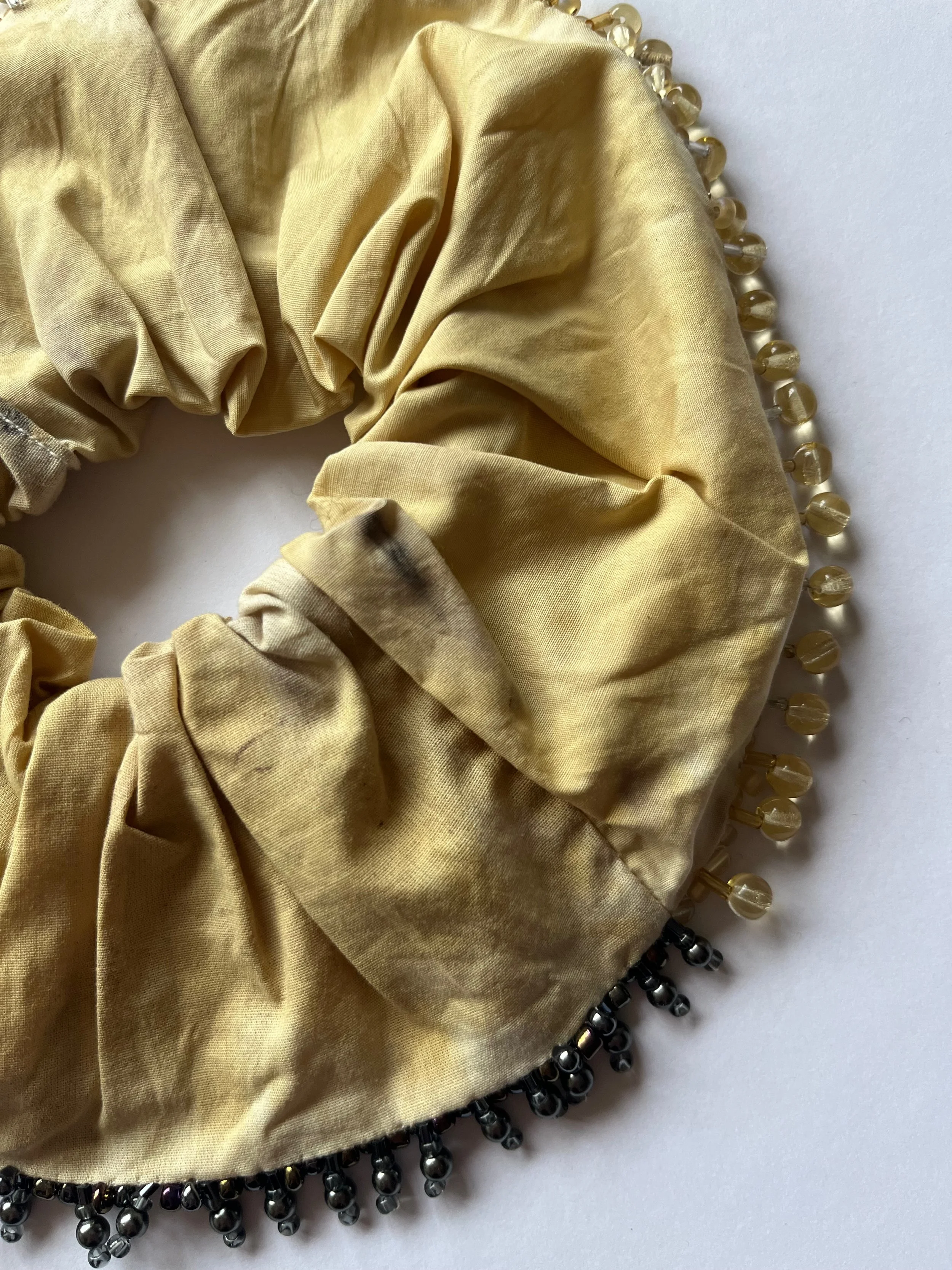 Medium-sized hair scrunchie naturally bundle dyed and with a beaded edge.