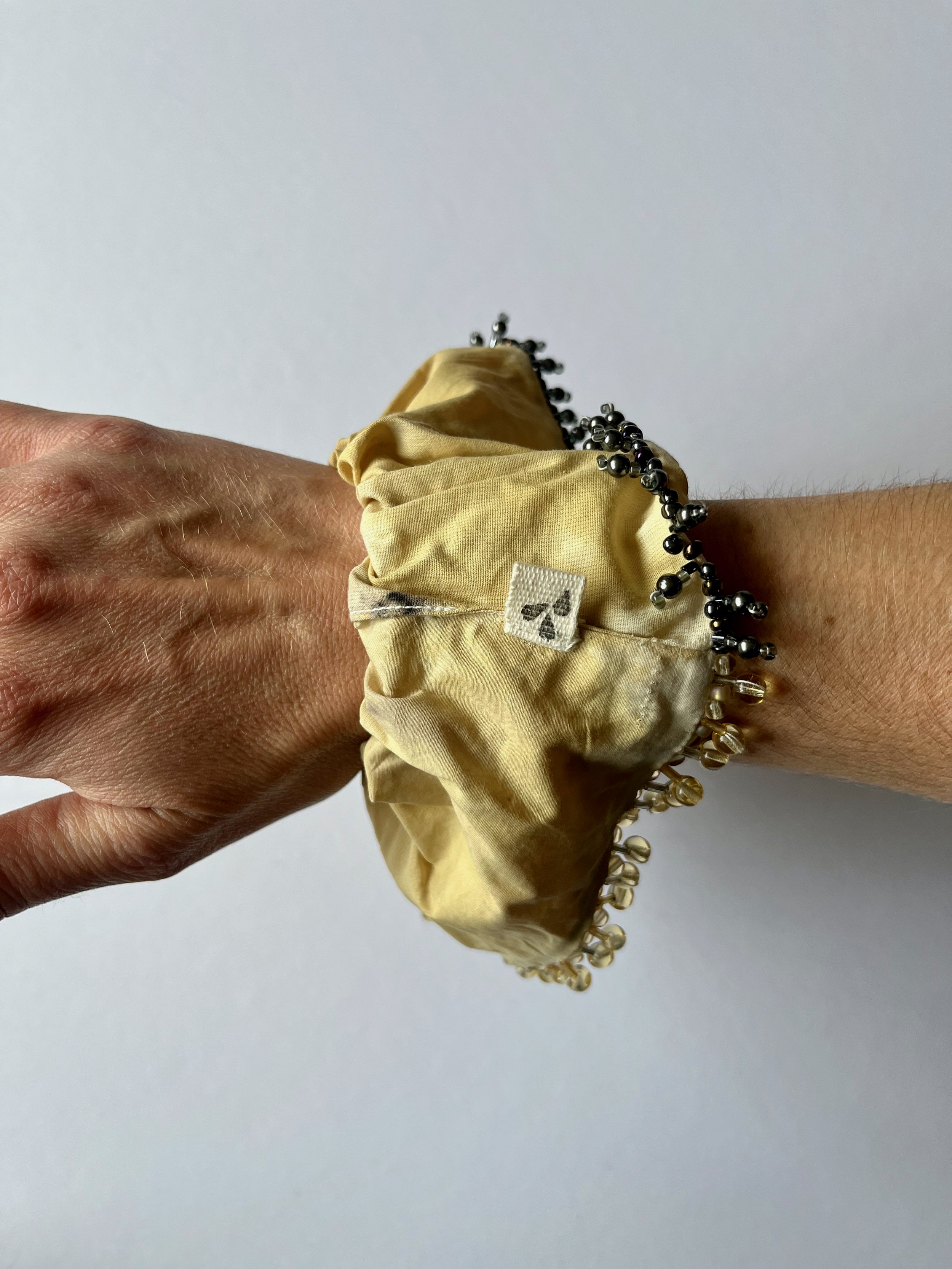 Though materials and making techniques have been employed to ensure as long a lasting product as possible (including internal French seams), this is an item that will be handled fairly heavily. Please note that over time the thread is likely to snap and beads will come loose. For this reason you are welcome to reach out for repair or a spare pack of beads to repair it yourself. It’s unlikely you’ll wash this accessory so the dyes should remain for some time, however, sunlight can cause degradation. Know that you are purchasing a handmade item.