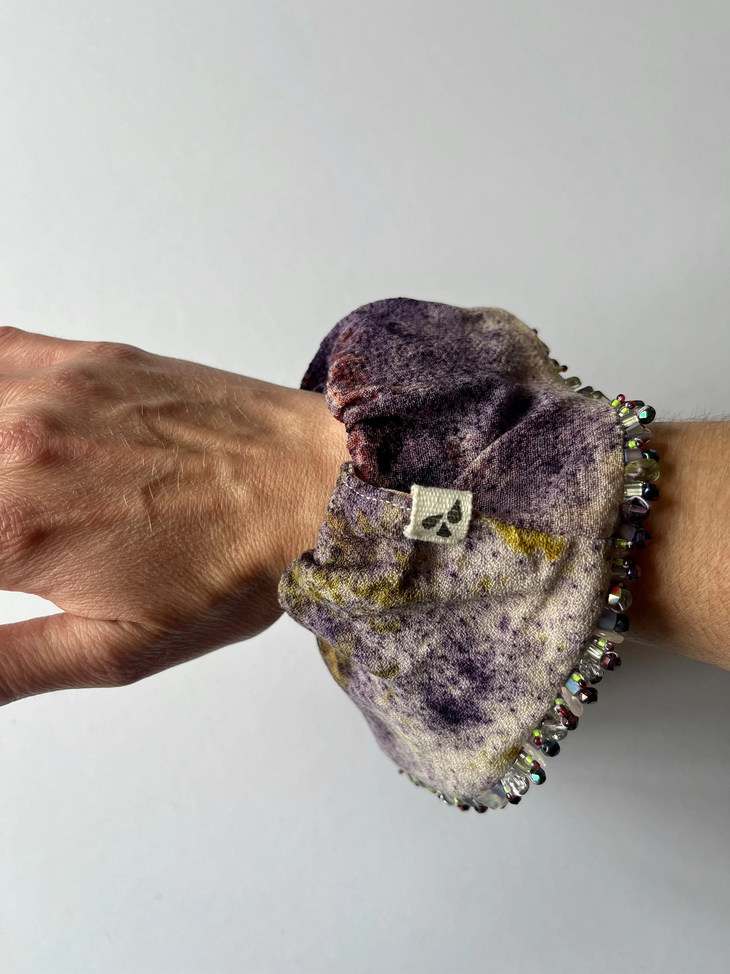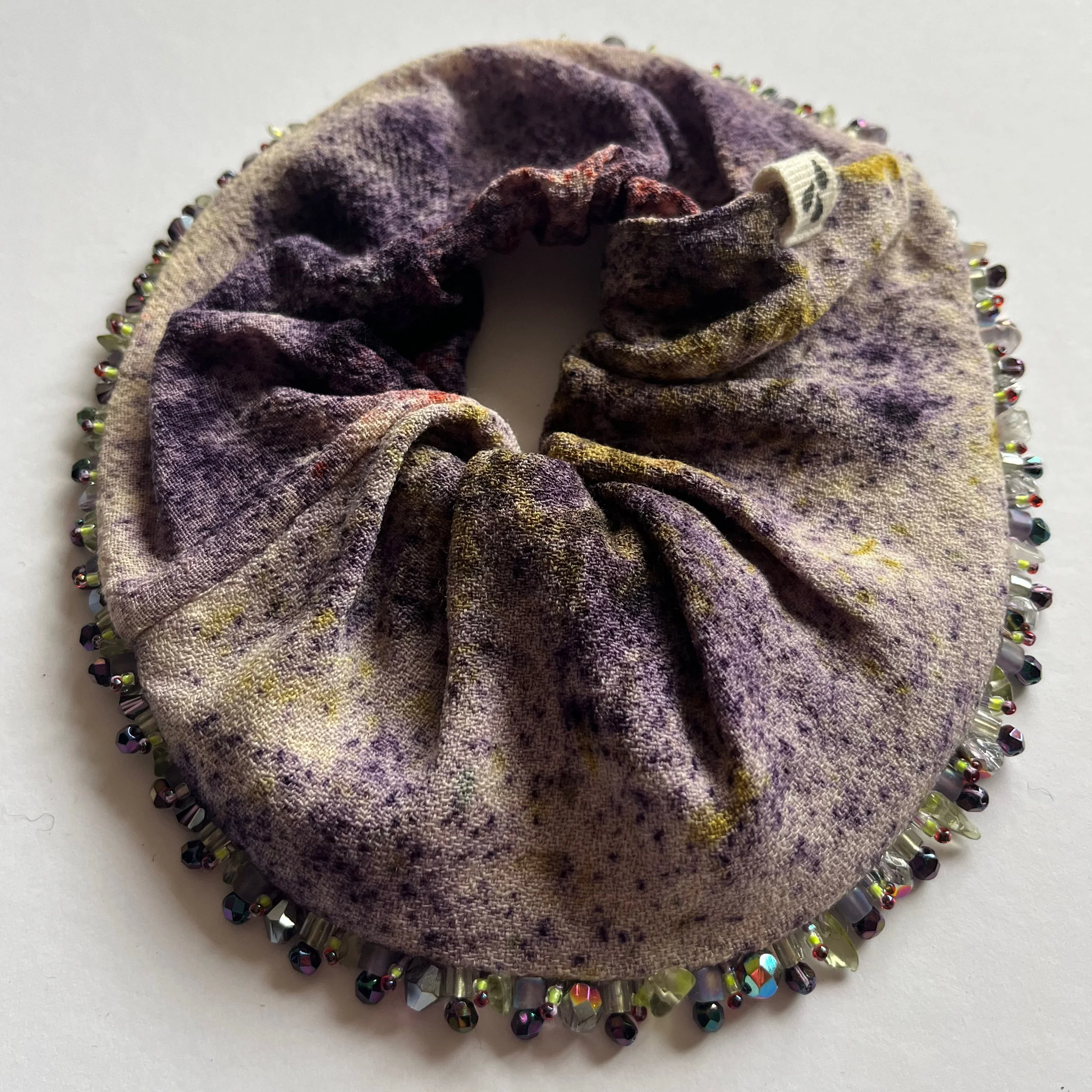 Medium-sized hair scrunchie naturally bundle dyed and with a beaded edge.