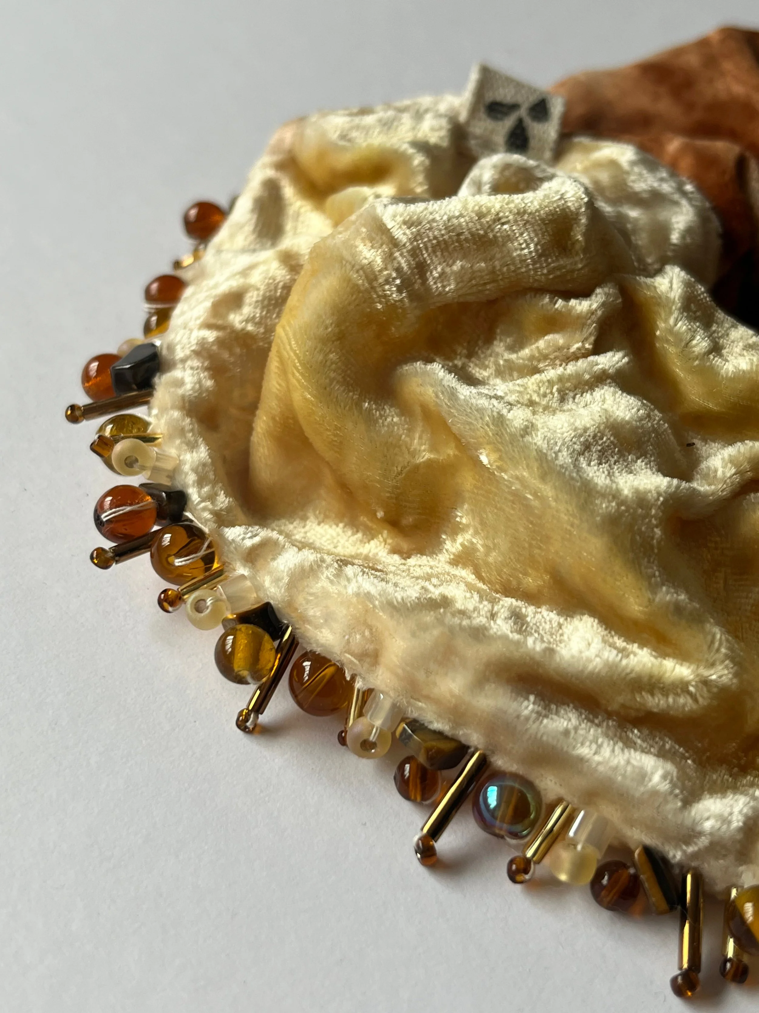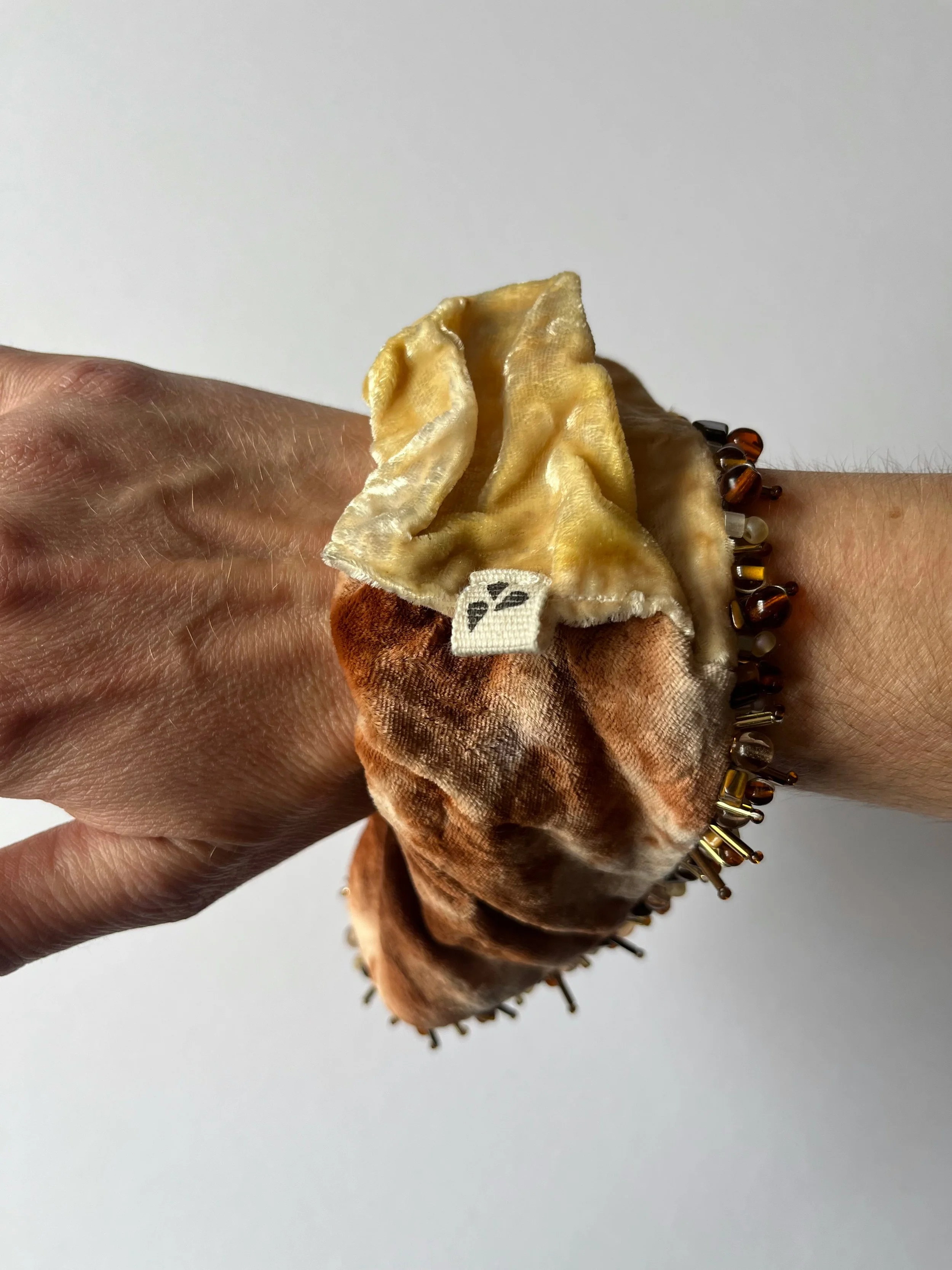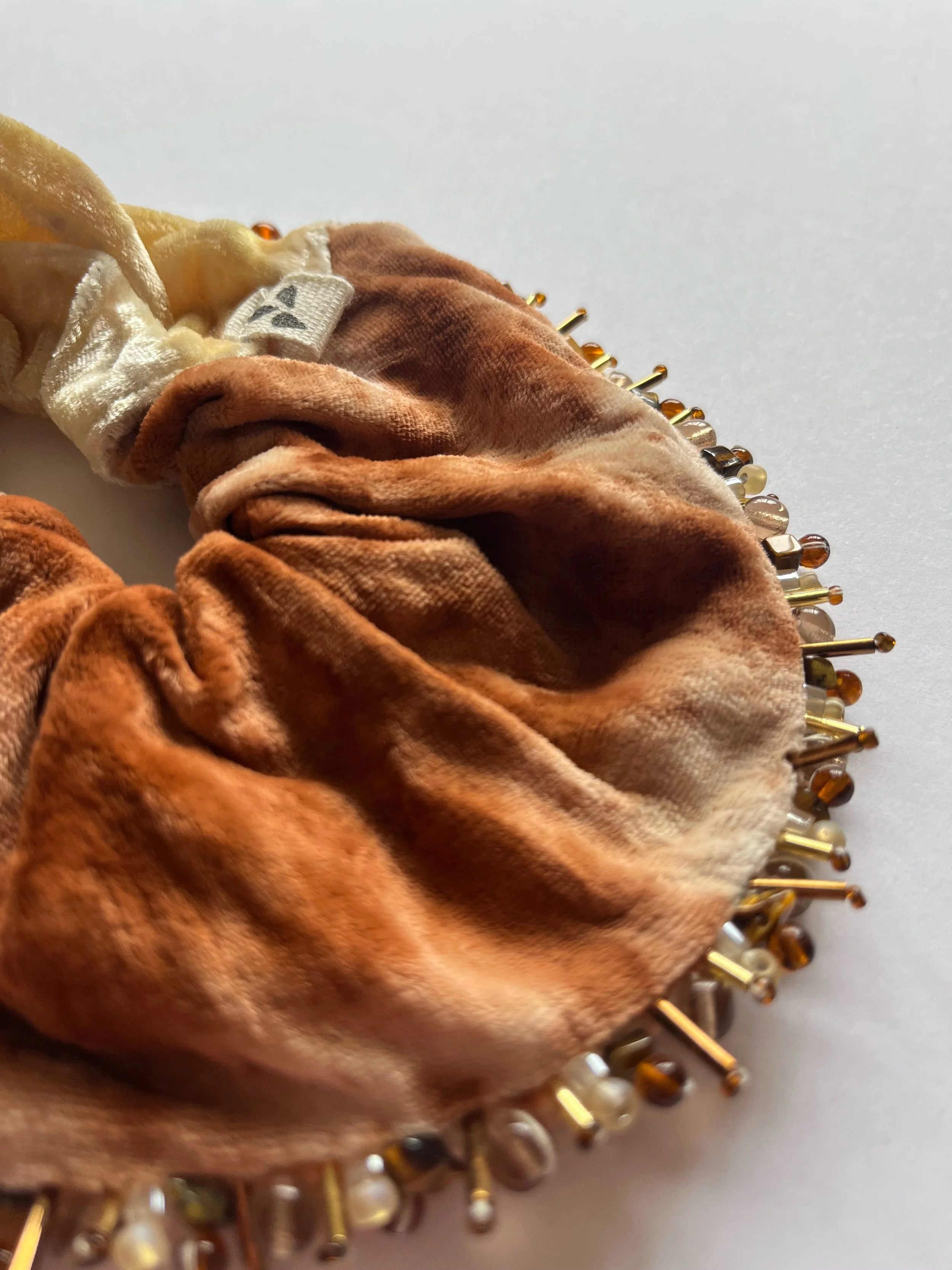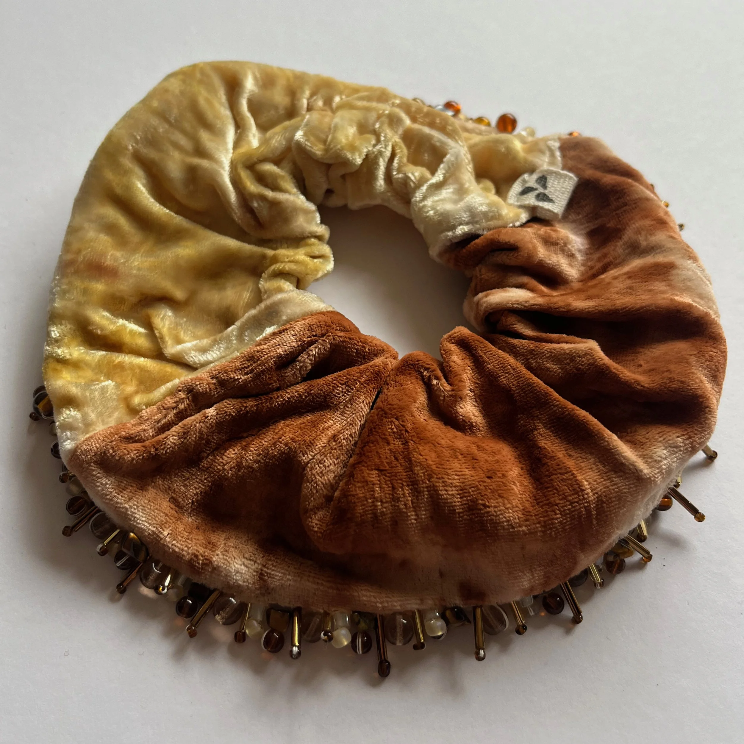 Medium-sized hair scrunchie naturally bundle dyed and with a beaded edge.