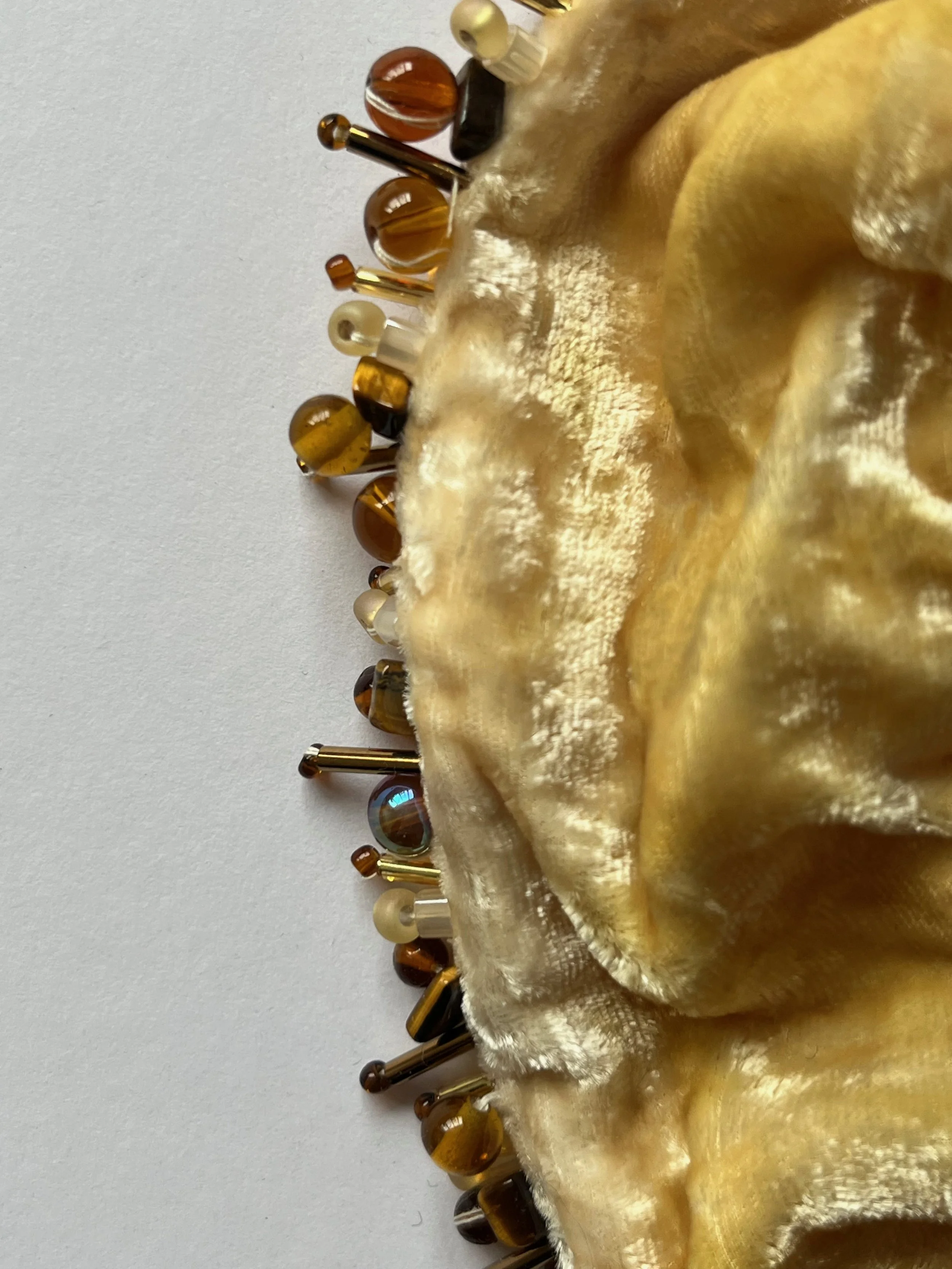 The beads were sourced many years ago from reclaimed and new sources. They are a combination of glass, semi-precious, pearl and plastic. They were stitched using a reclaimed polyester thread.