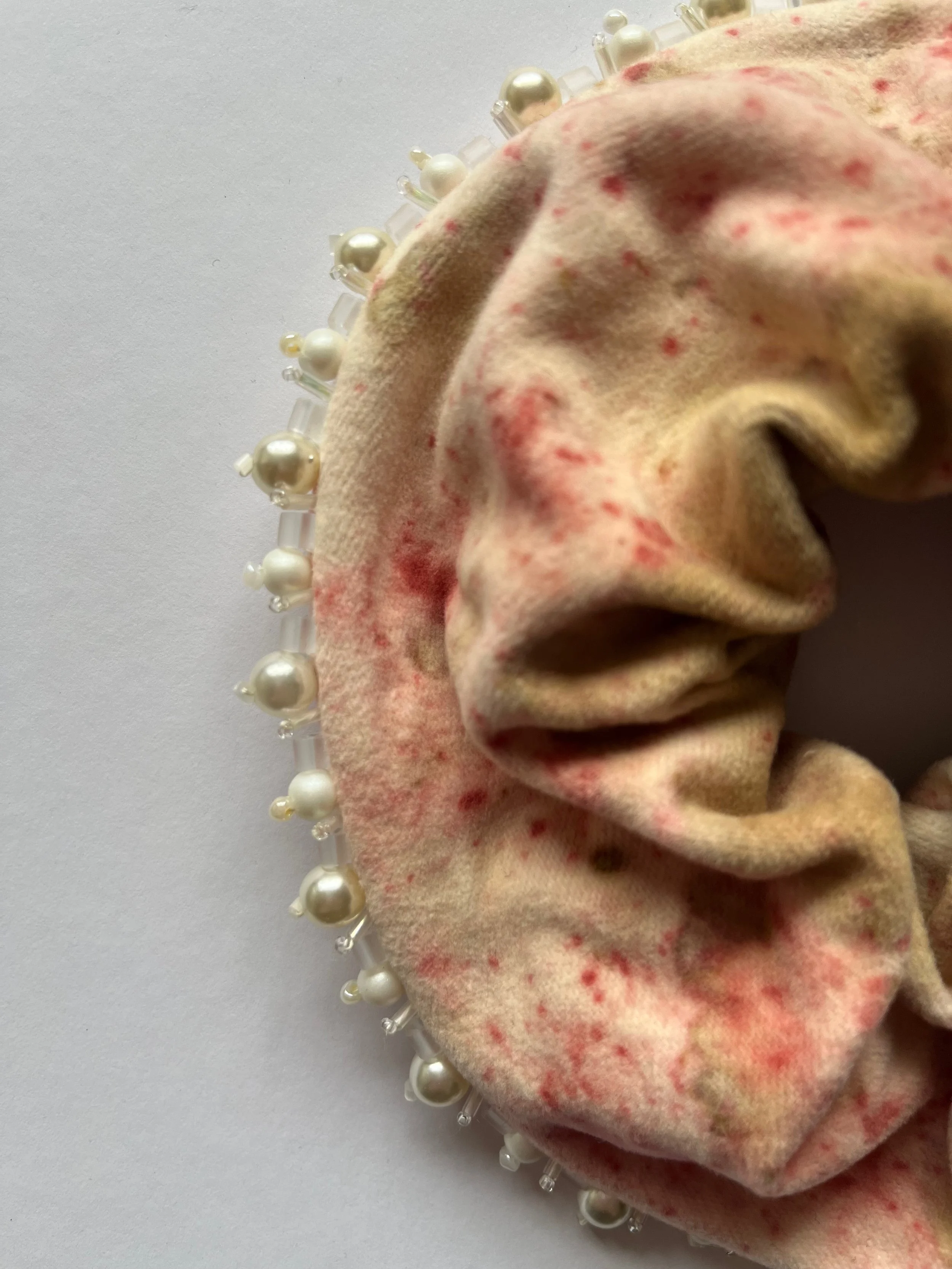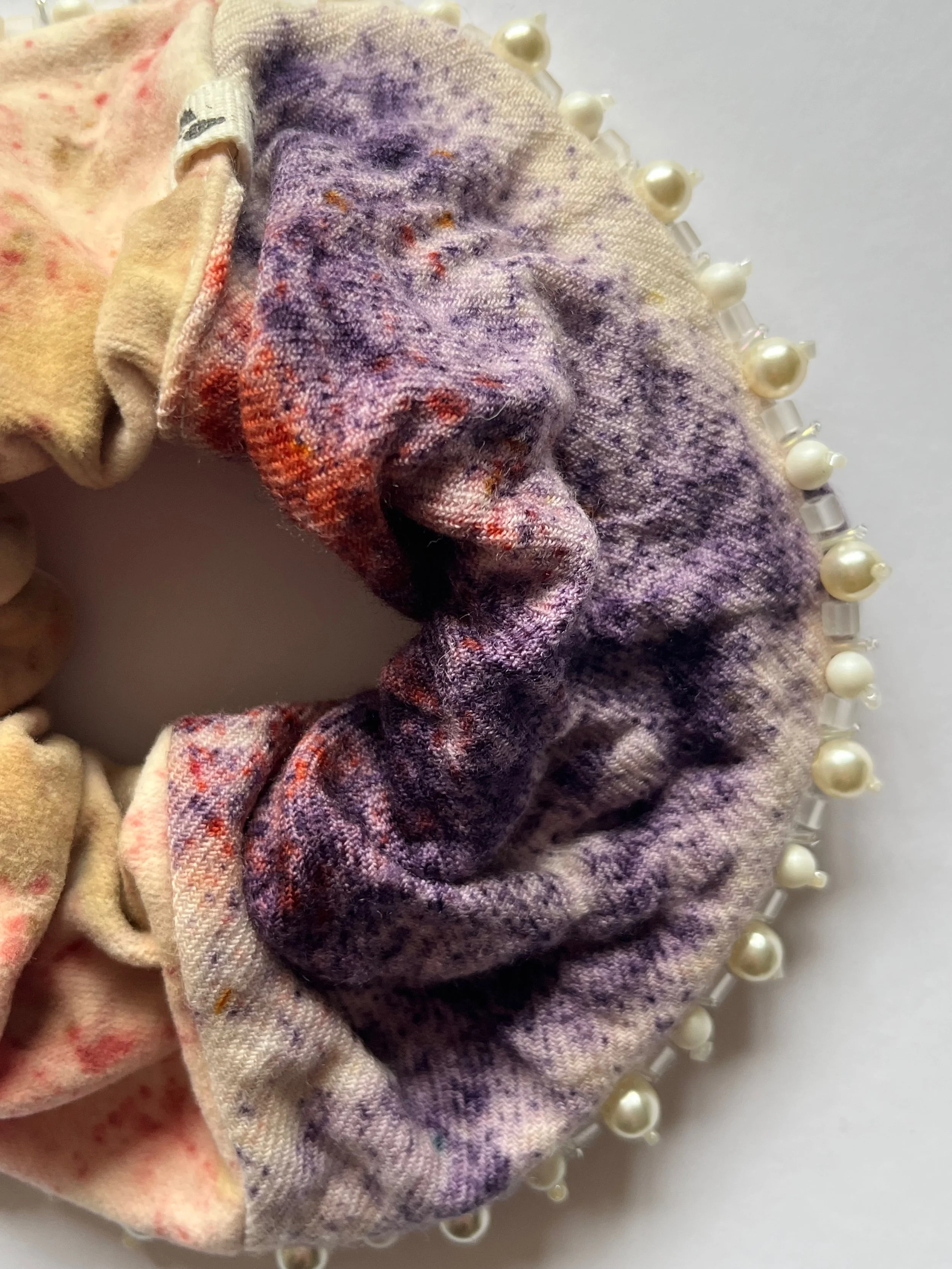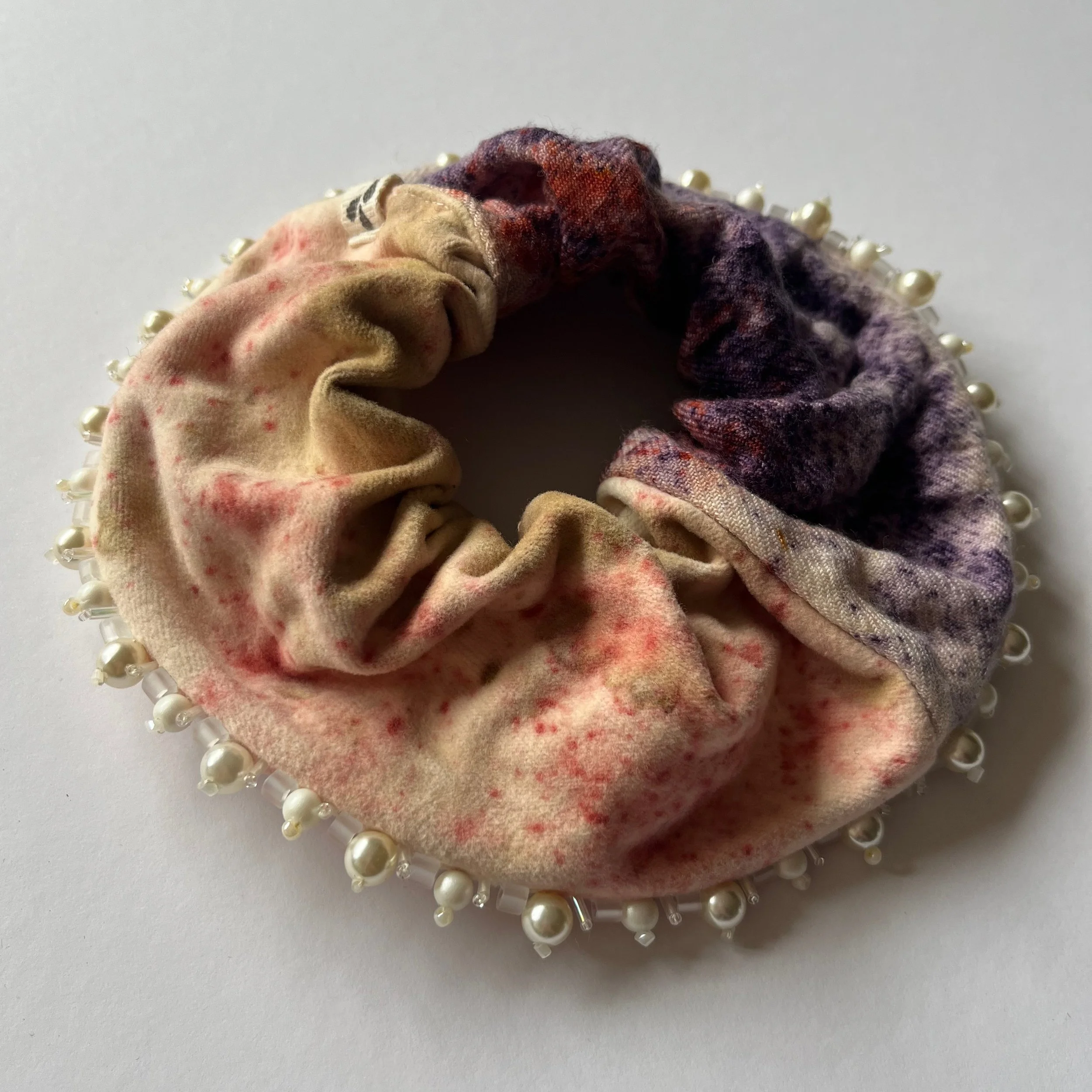 Medium-sized hair scrunchie naturally bundle dyed and with a beaded edge.