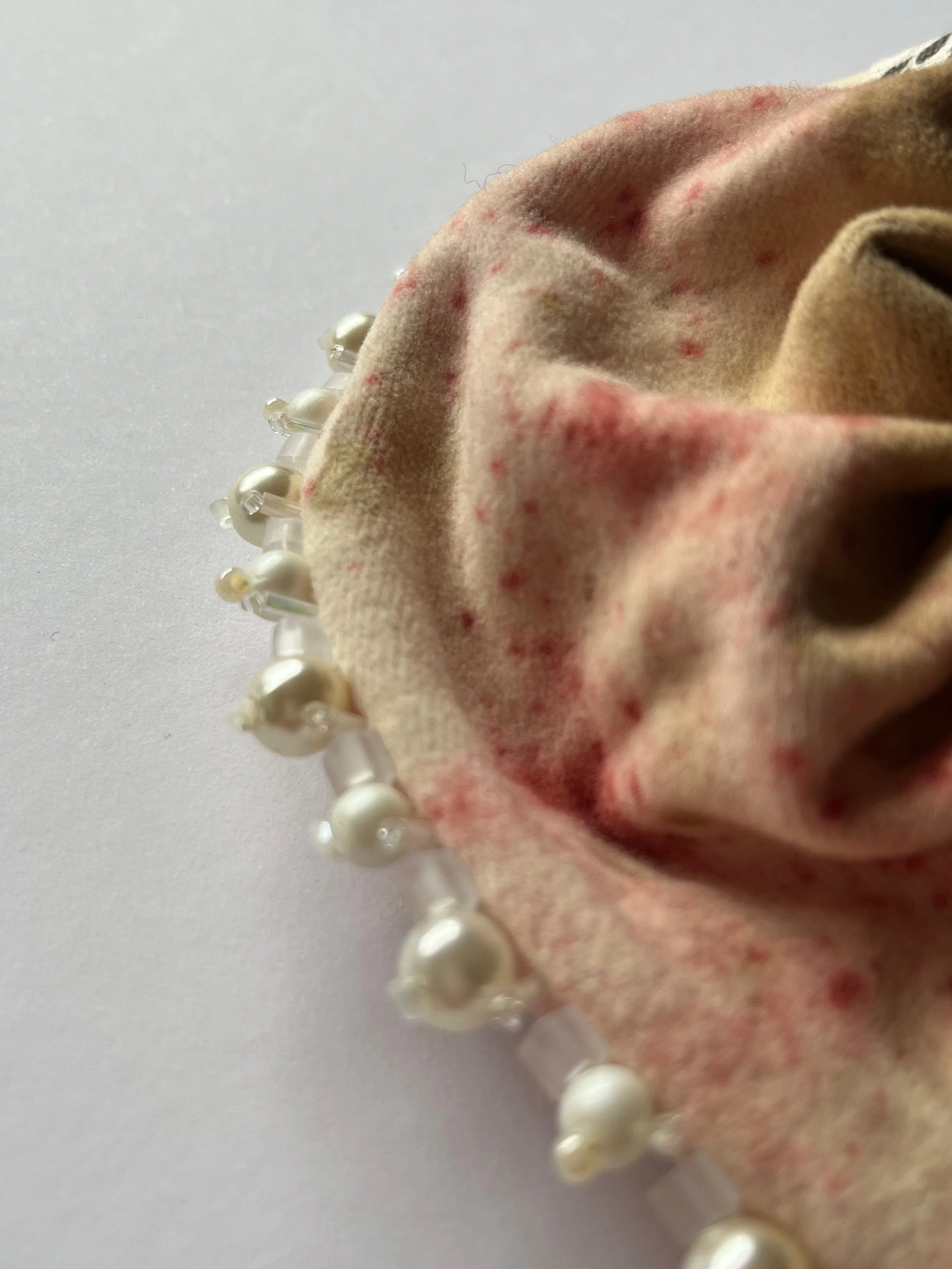 Though awareness that both natural and synthetic fibres are included in some of the fabric samples, it is tricky to know fully the true composition due to these being swatches. While I would normally create items that are either a fully biological cycle or a fully technical cycle (read about design-for-diassembly / cradle to cradle), in this instance there isn’t enough transparency. Therefore, the decision was made to use polyester thread instead of organic cotton for its tensile strength, creating a longer-lasting product, and utilising any selection of beads (not just plastic or not just glass).