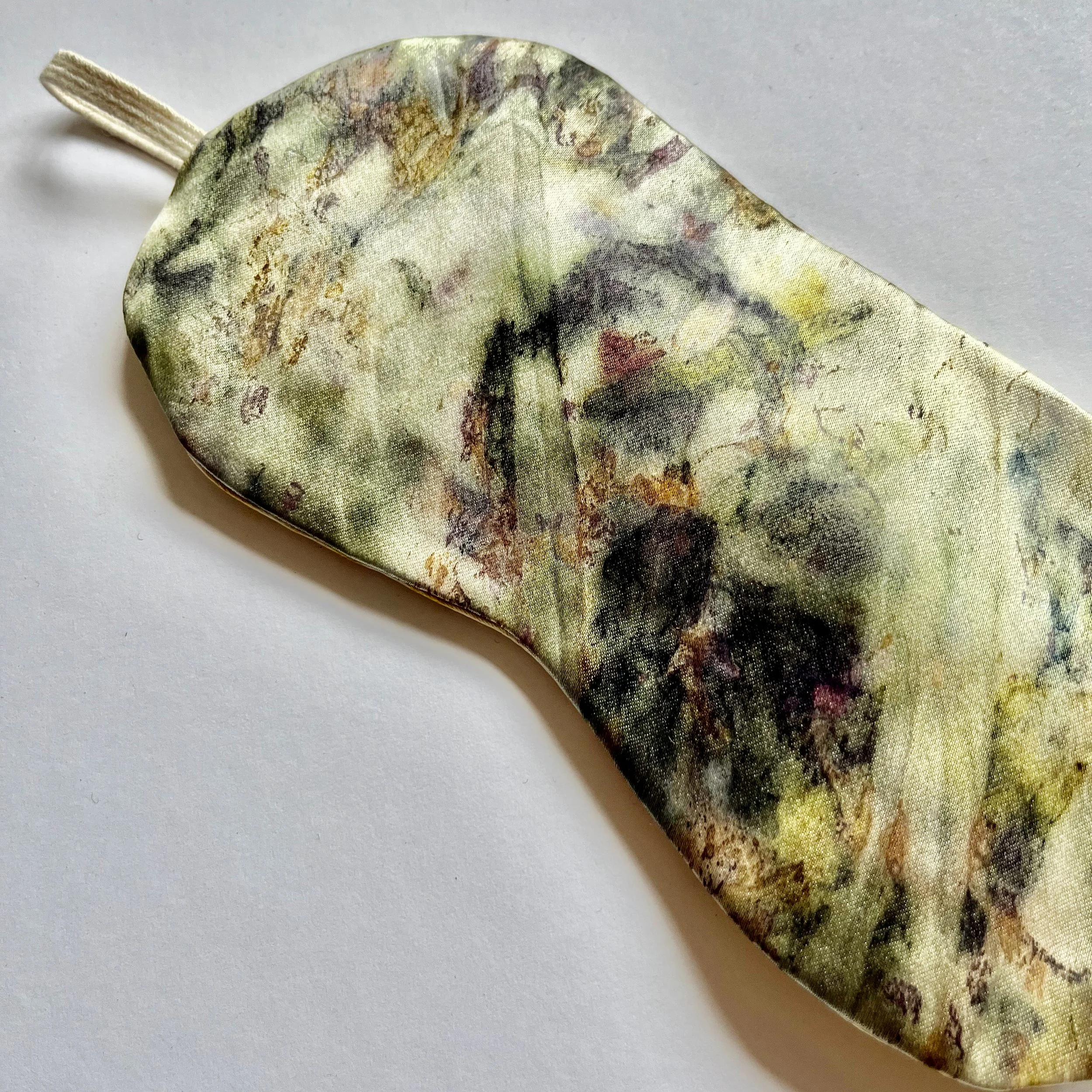 Reversible bundle-dyed silk satin eye mask for sleep and travel.