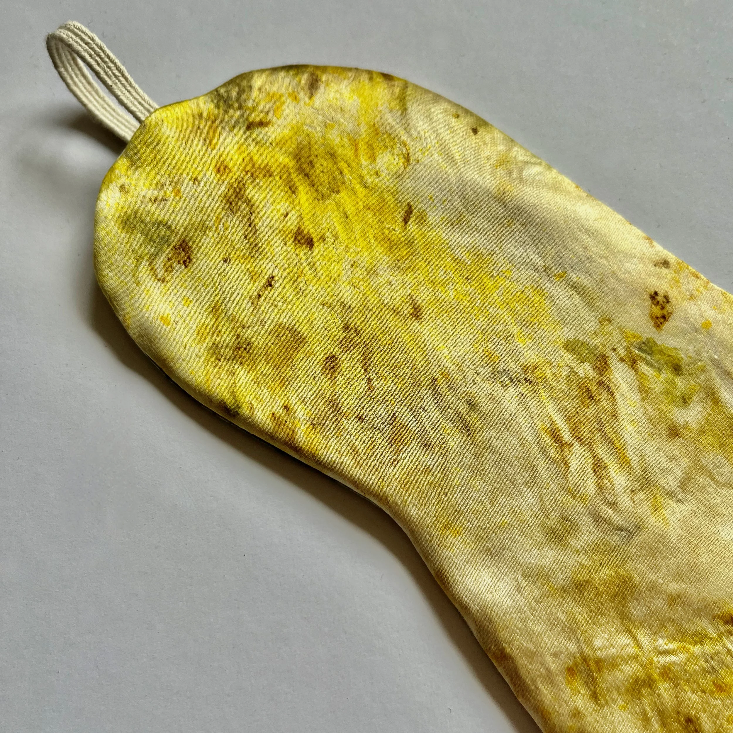 The silk was first washed in detergent to remove any surface dirt. Then each scrap was individually dyed with a curated selection of plants and pigments to achieve the colour and pattern using the bundle dye method. These colours will naturally fade over time, due to sunlight and washing. Silk - as a protein fibre - has good affinity with dyes, and the least toxic mordants can break down protein fibres, so a mordant solution was not used.
