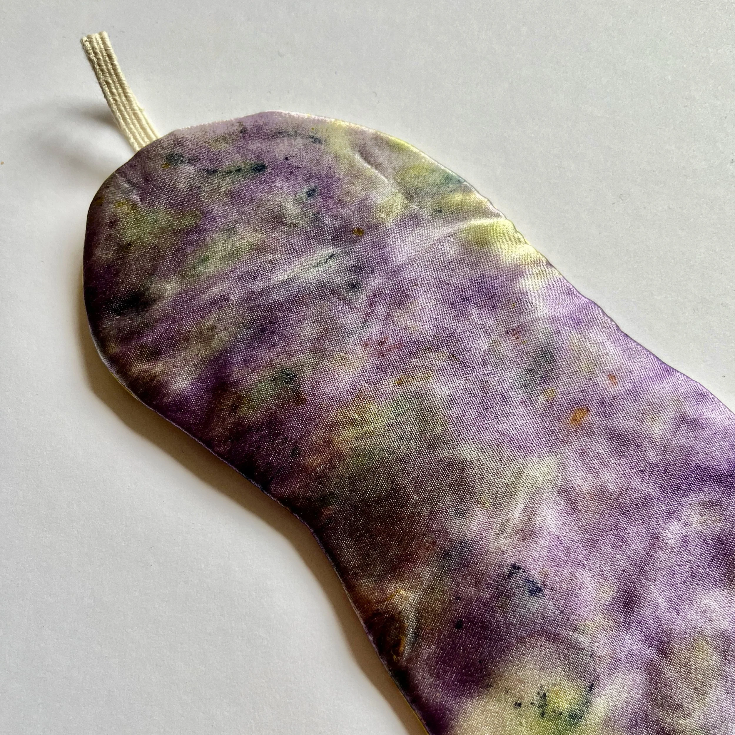 This one specifically has electrifying purple on one side, with warm yellow on the other side. Including such ingredients as, but not exclusive to: (purples) logwood powder, iris, eucalyptus, viola, elderberry, weld, common mallow / (yellows) rose, weld, dyer’s greenweed, dyer’s camomile, St John’s wort, goldenrod.