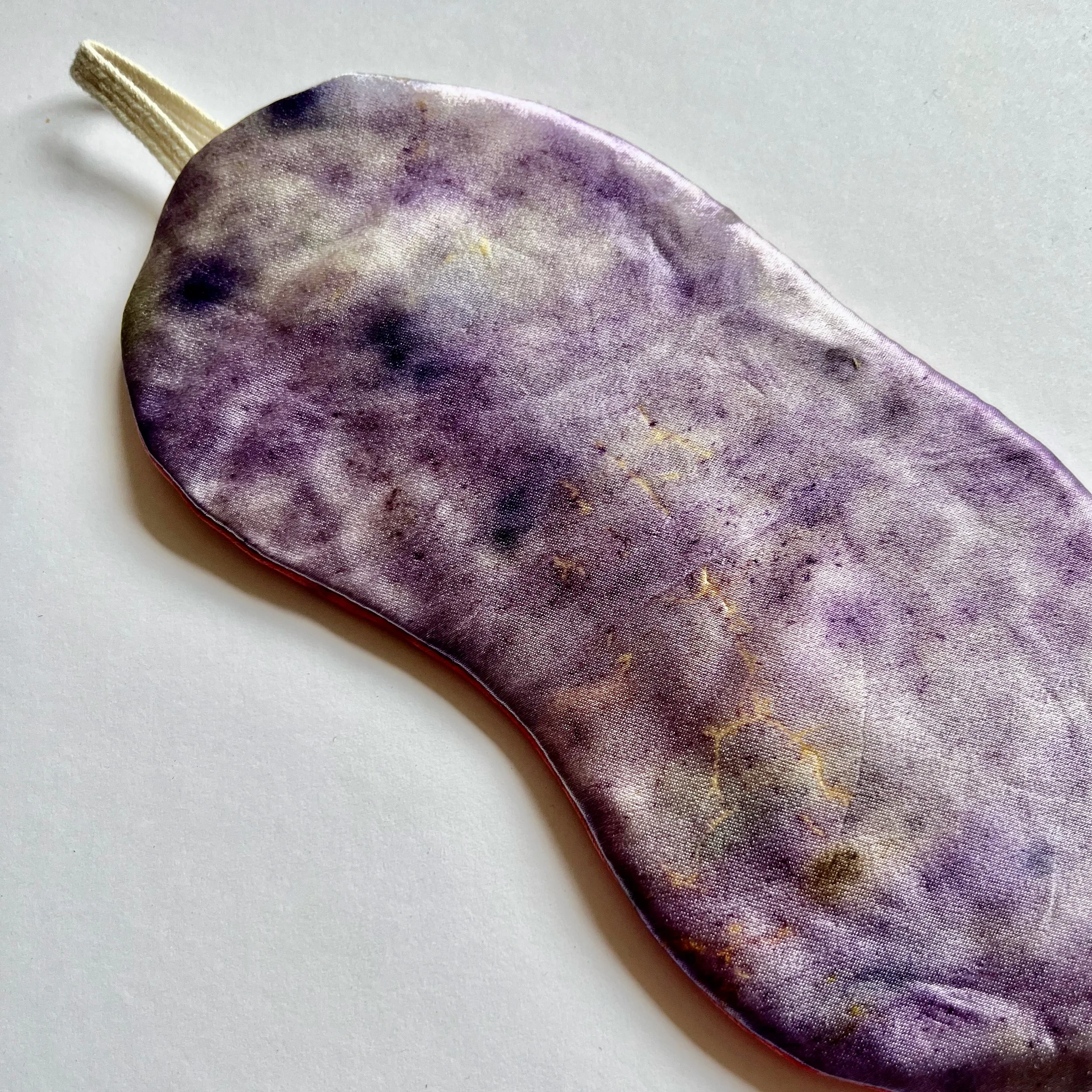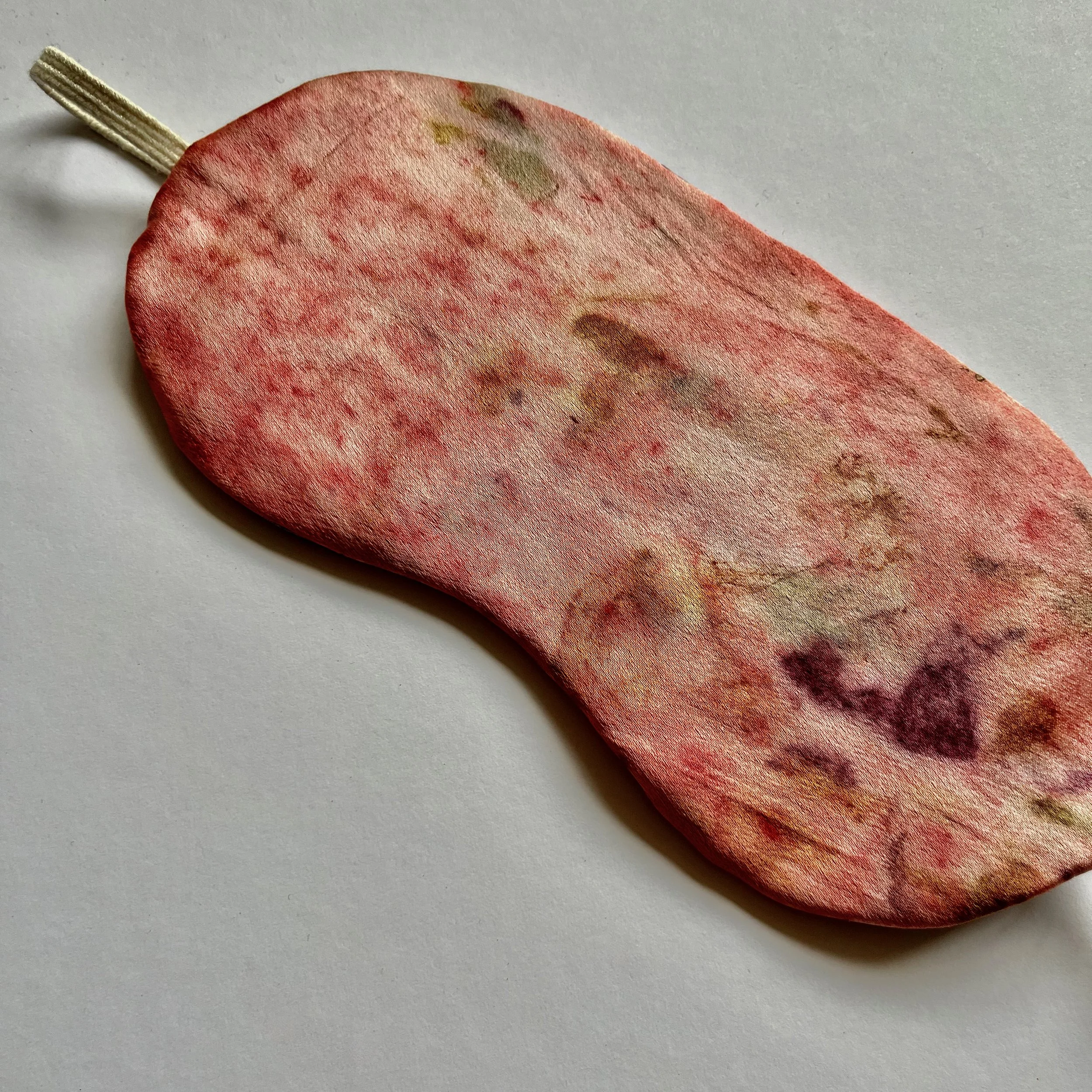 Reversible bundle-dyed silk satin eye mask for sleep and travel.