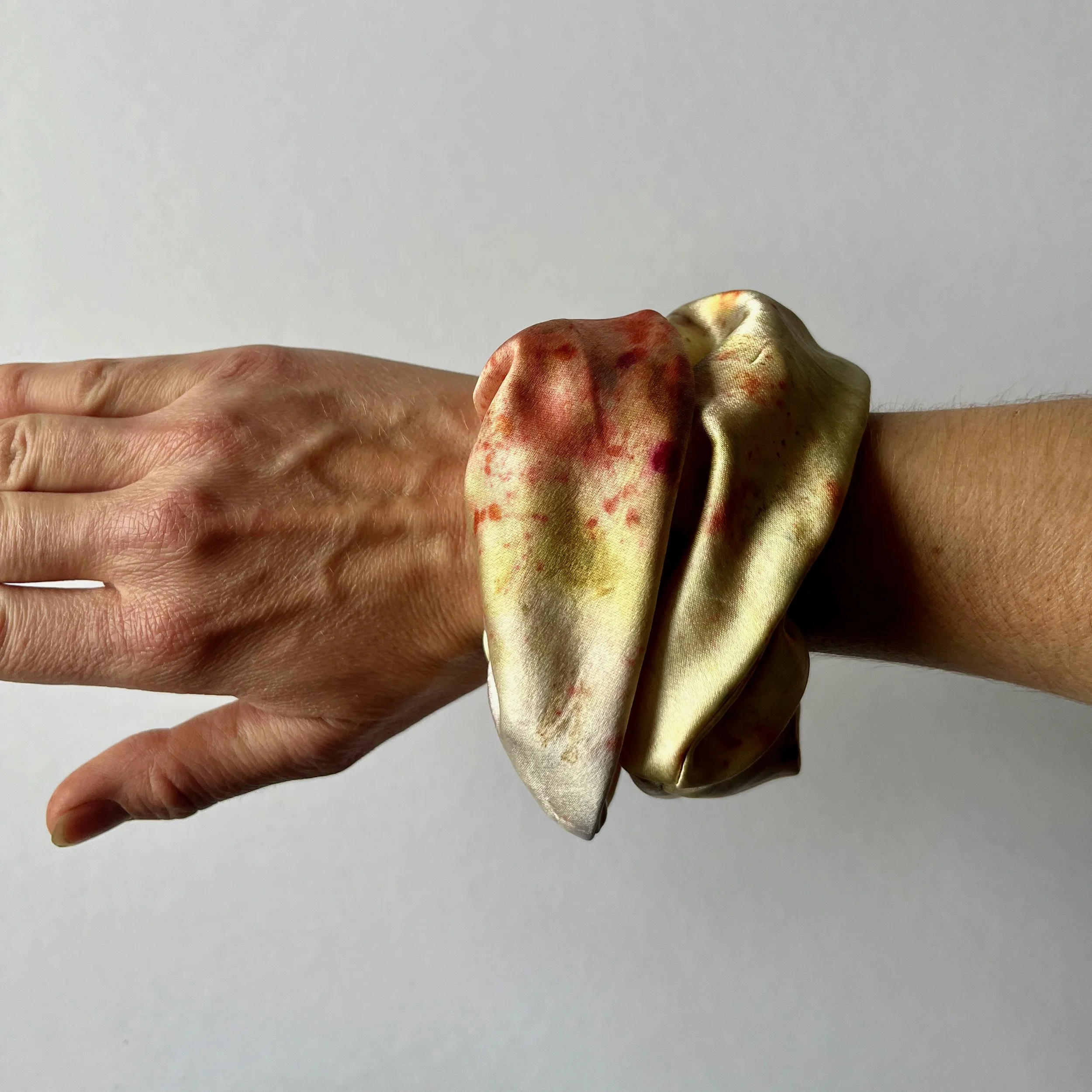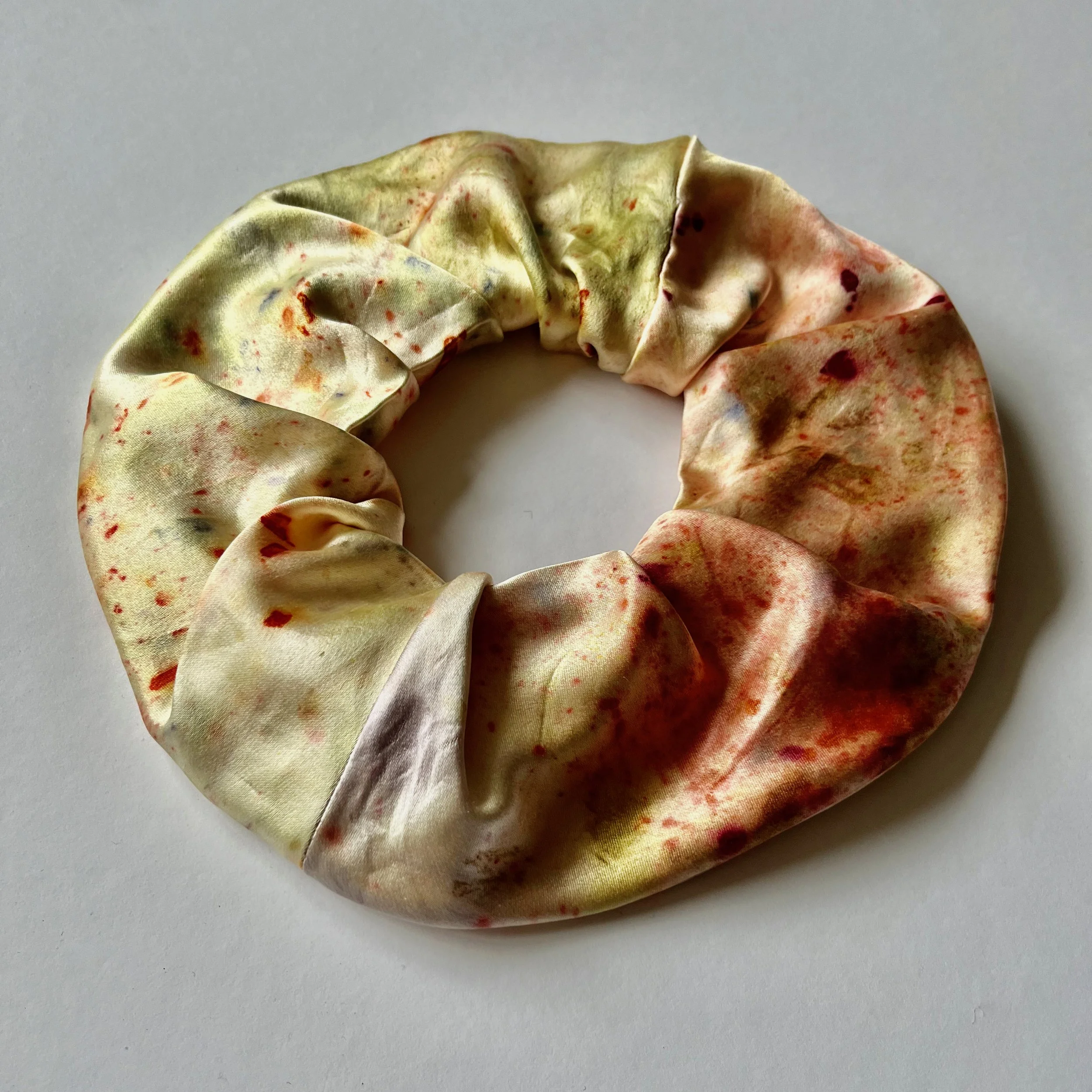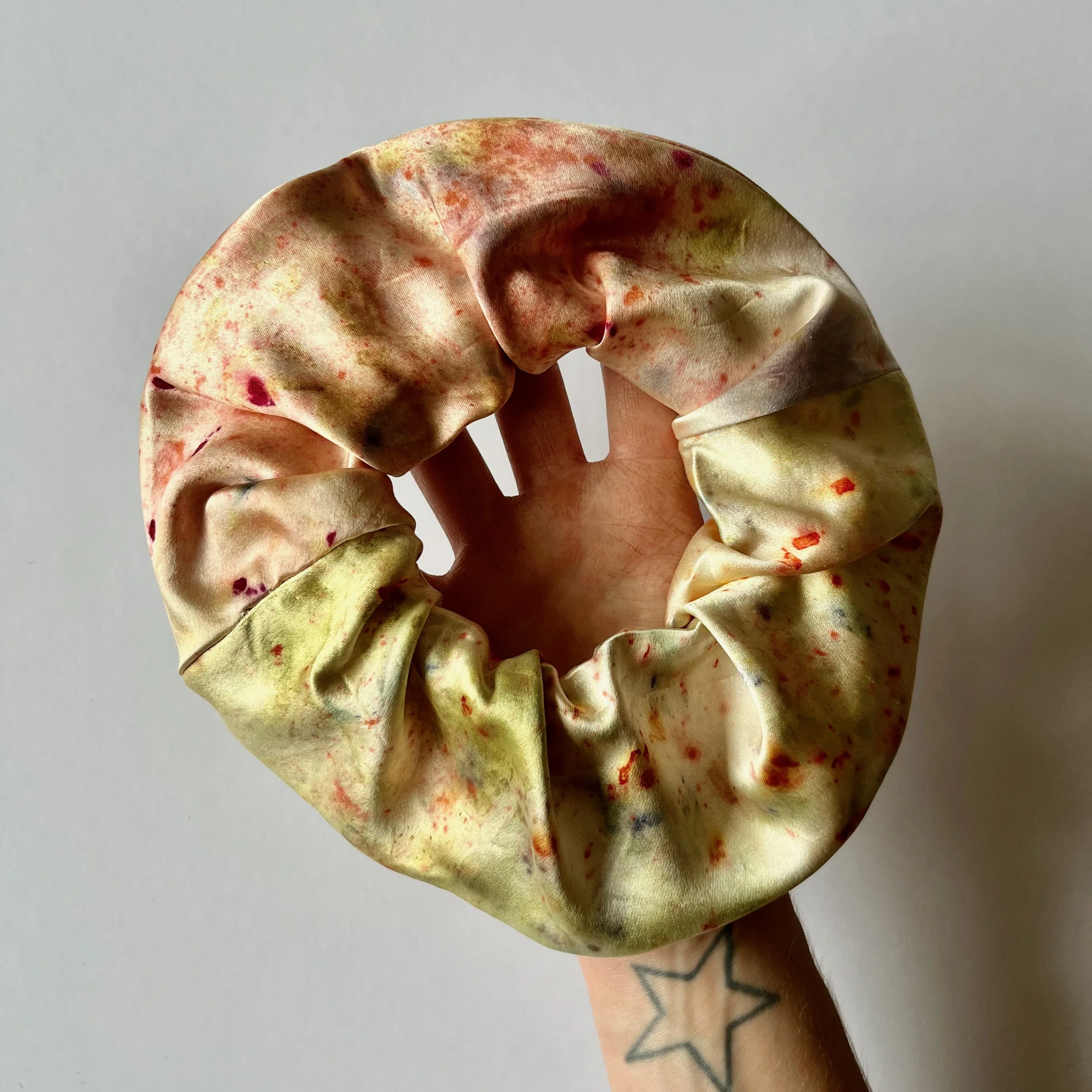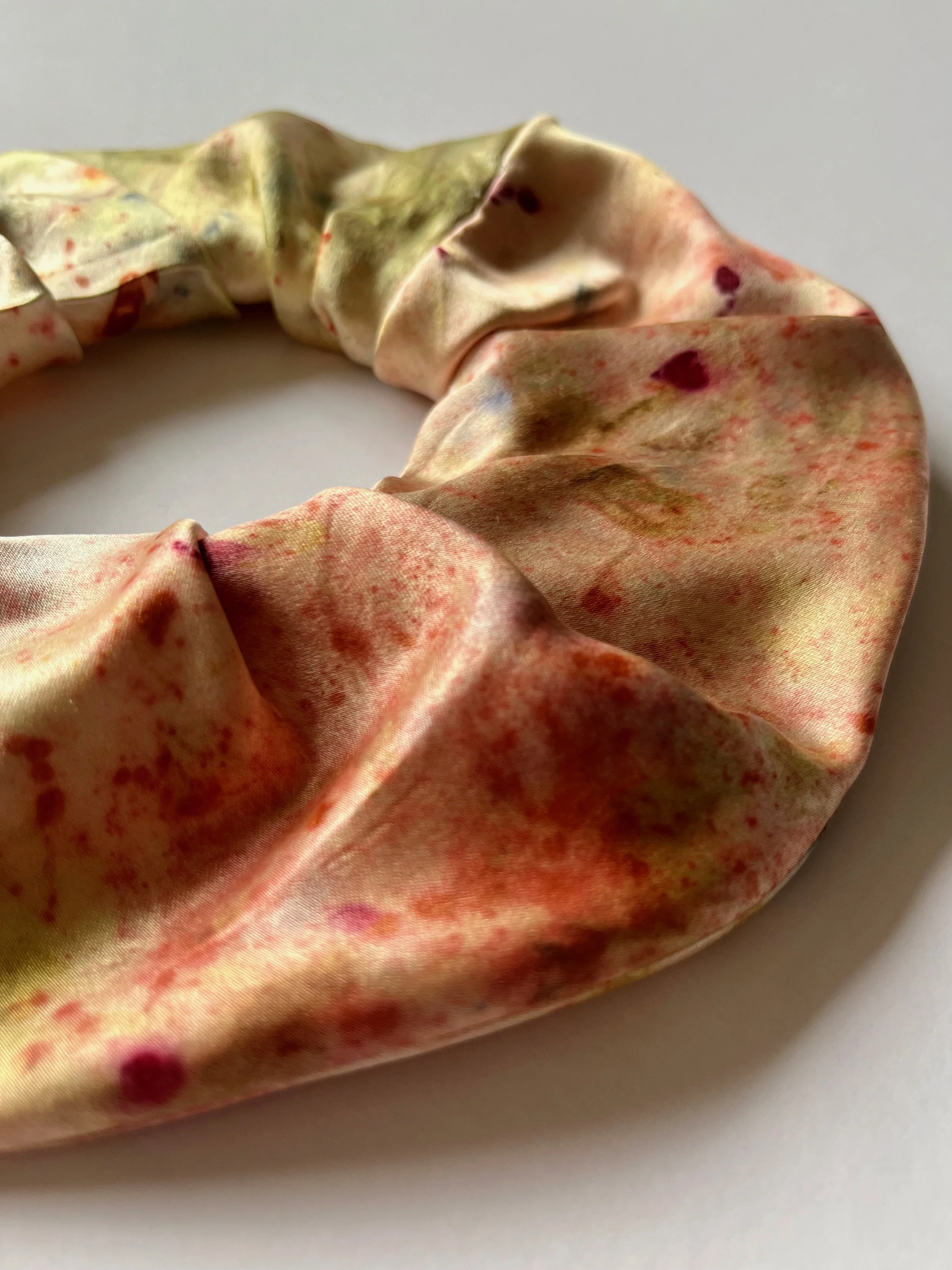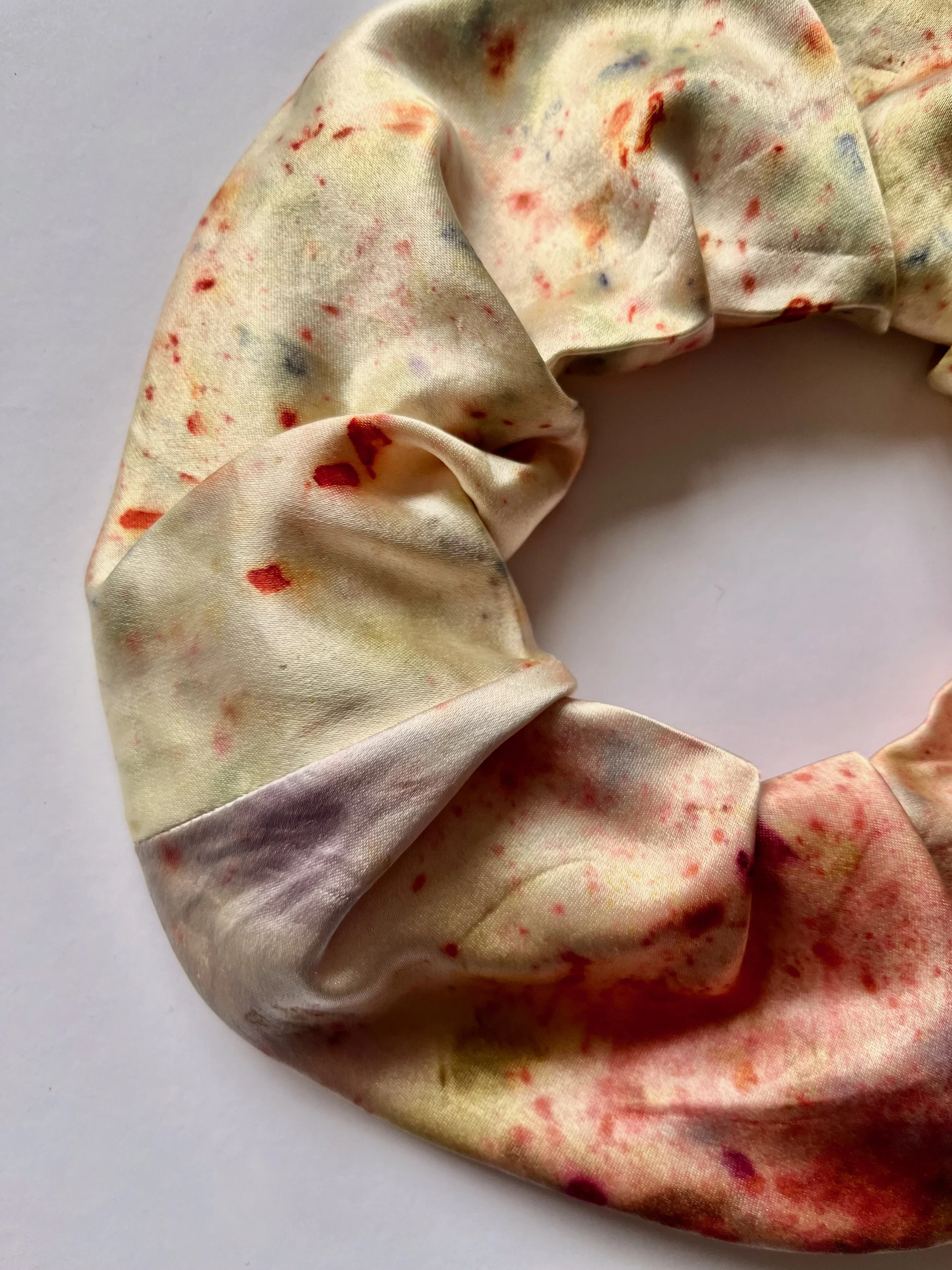 Each scrunchies uses two colourways. This one specifically has galaxy pinks on one side, with tranquil warm pinks on the other side. Including such ingredients as, but not exclusive to: (galaxy pinks) hollyhock, cochineal, poppy, madder powder, sage / (tranquil pinks) sumac, tree mallow, hydrangea, avocado skin, rose, madder root, madder powder.