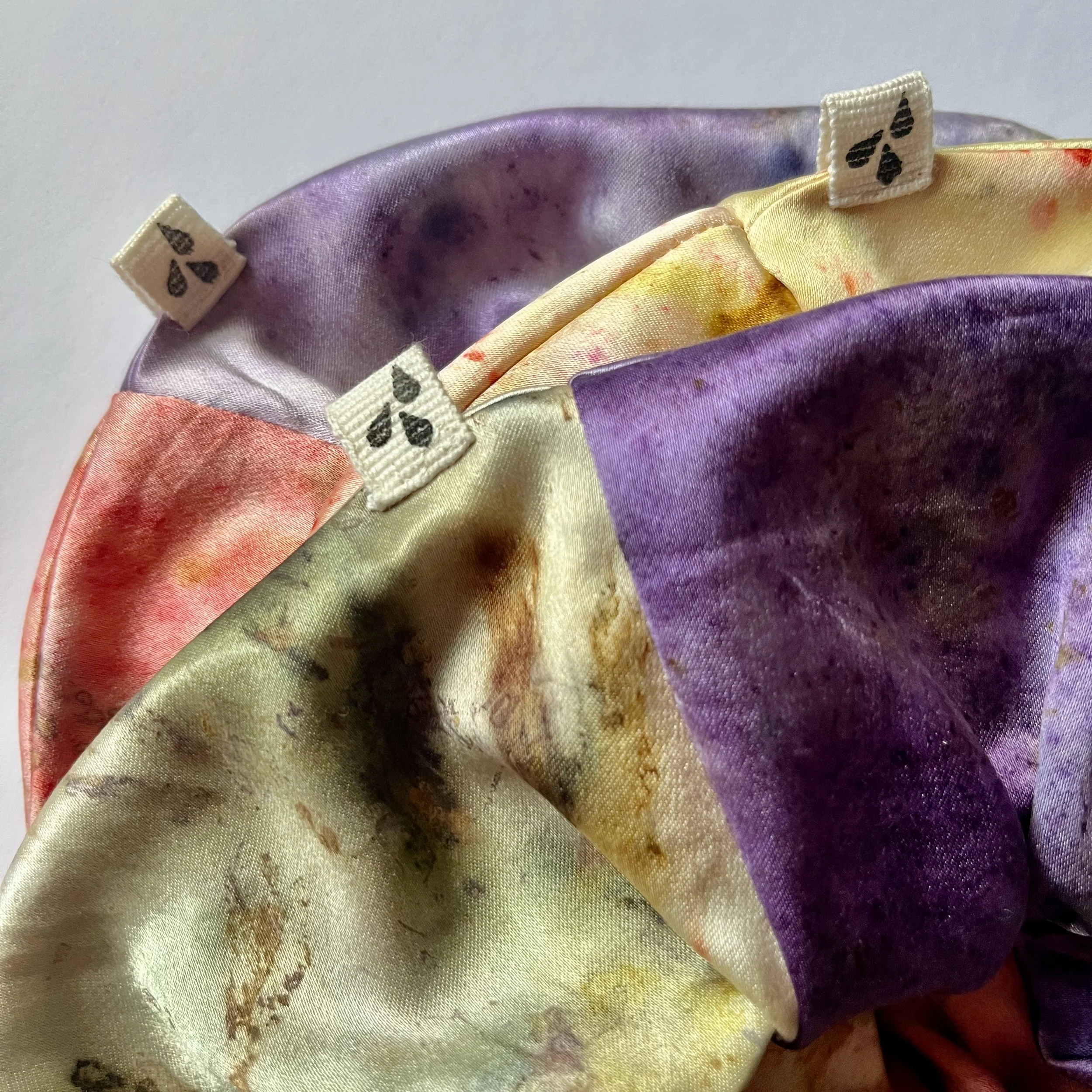 The silk was first washed in detergent to remove any surface dirt. Then each scrap was individually dyed with a curated selection of plants and pigments to achieve the colour and pattern using the bundle dye method. These colours will naturally fade over time, due to sunlight and washing. Silk - as a protein fibre - has good affinity with dyes, and the least toxic mordants can break down protein fibres, so a mordant solution was not used.