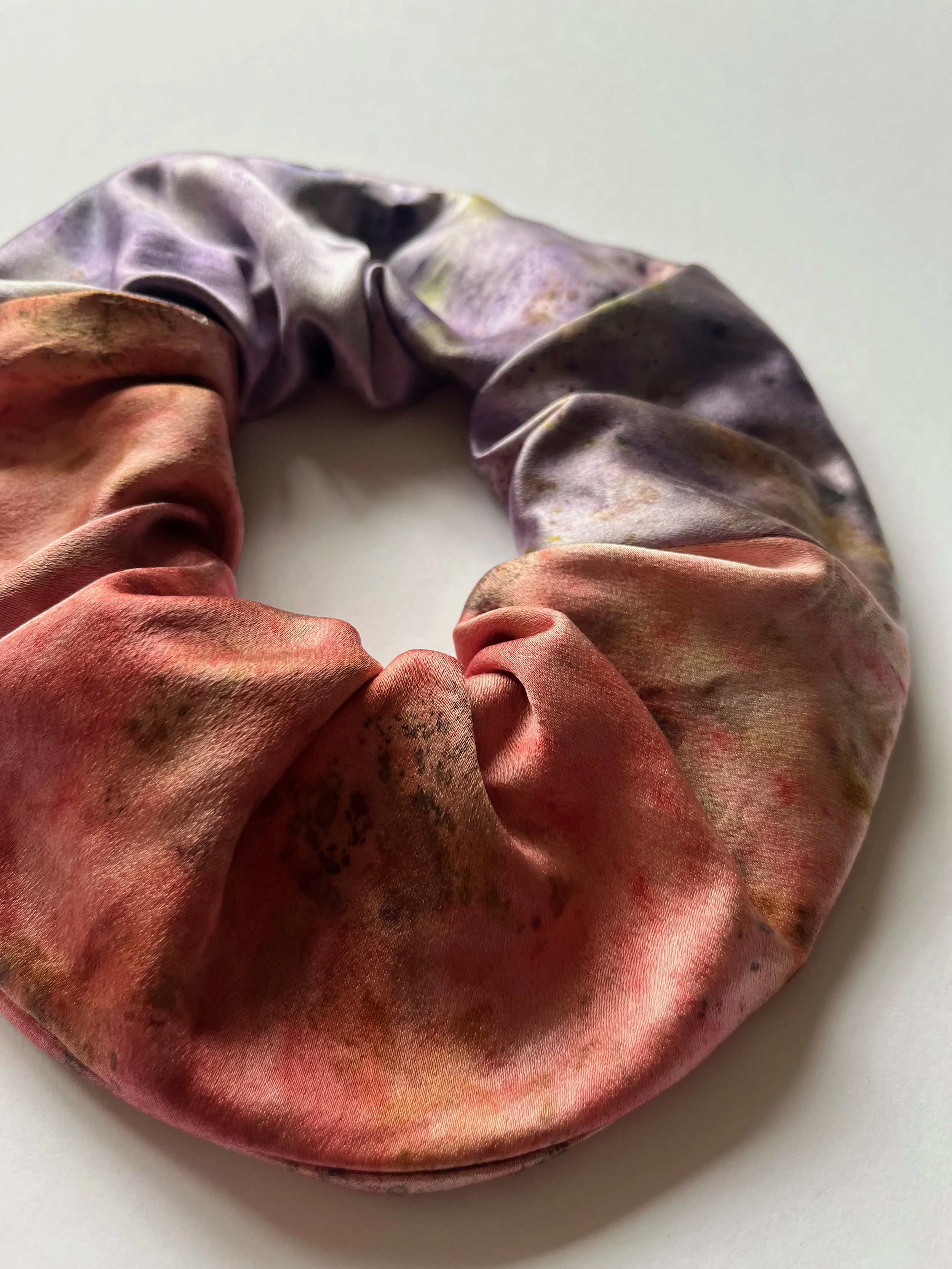 Large bundle-dyed silk satin hair scrunchie.
