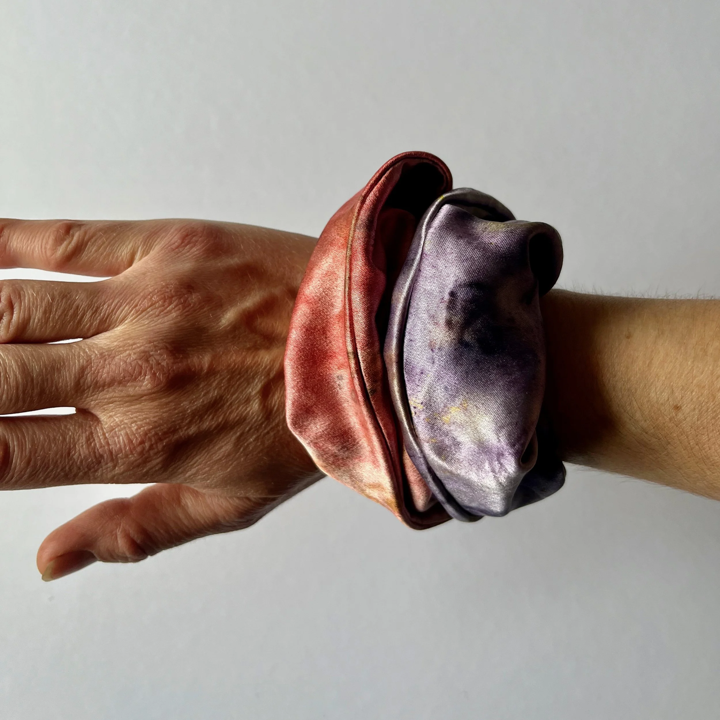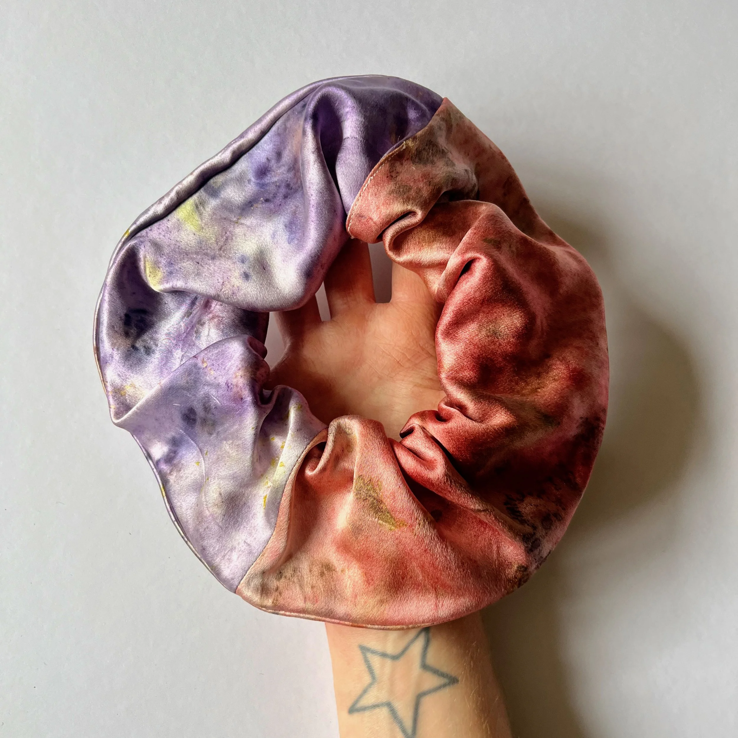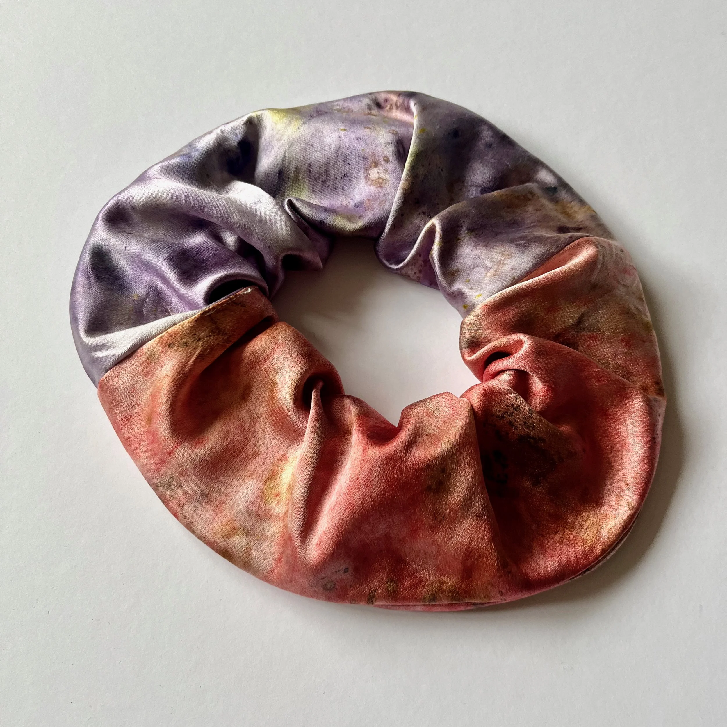 Each scrunchies uses two colourways. This one specifically has vibrant pinks on one side, with energetic purple on the other side. Including such ingredients as, but not exclusive to: (pinks) madder powder, poppy, rose, hollyhock, common mallow / (purple) logwood powder, iris, eucalyptus, viola, elderberry, weld, common mallow.