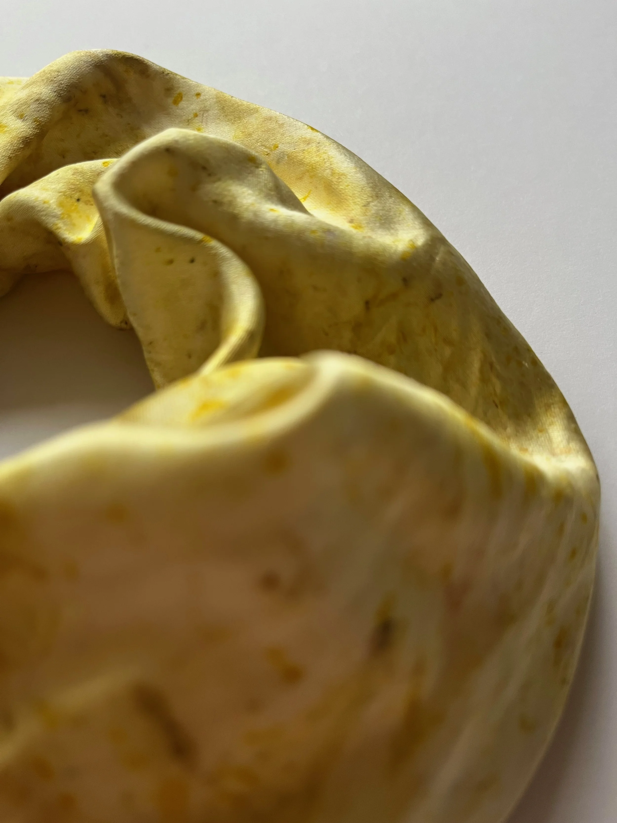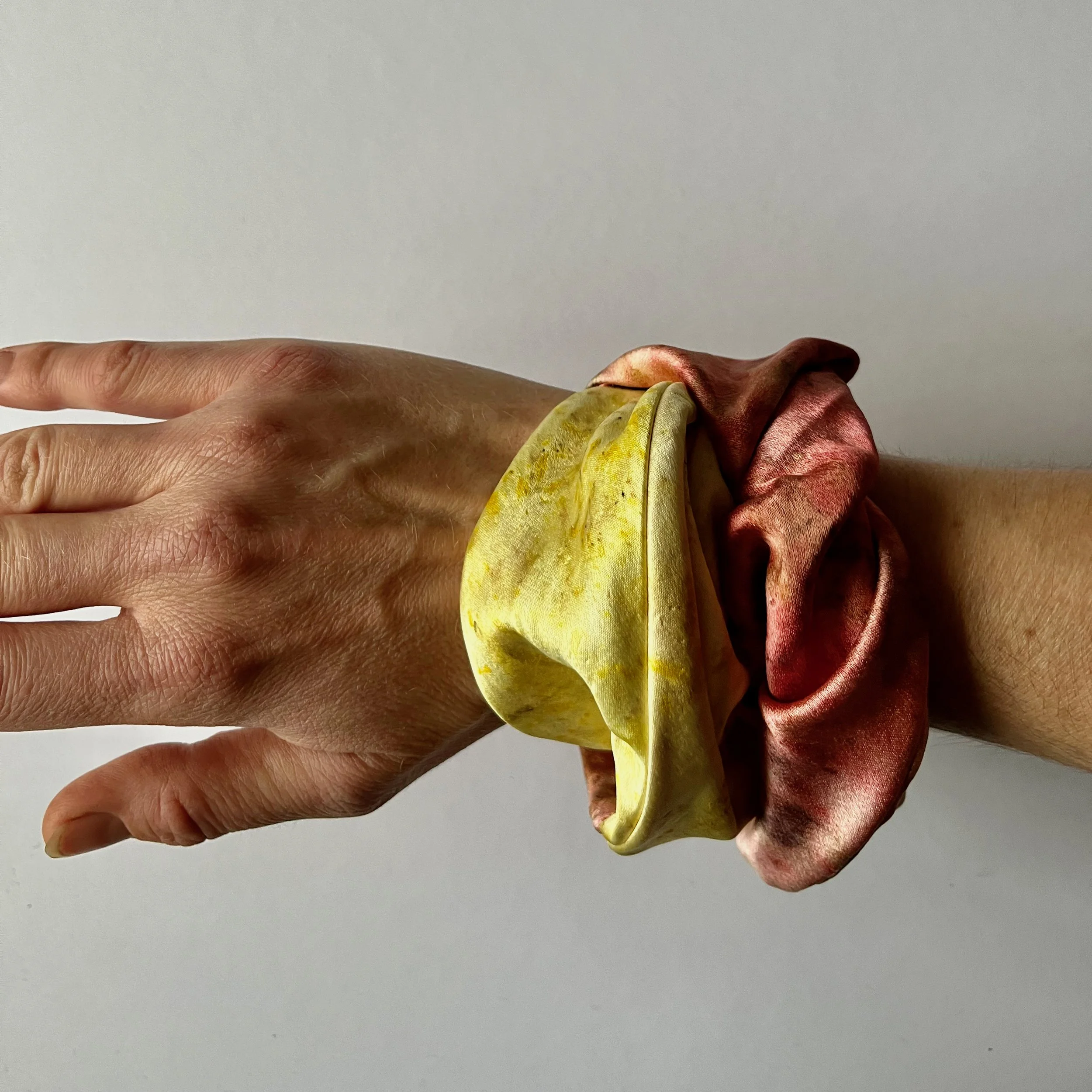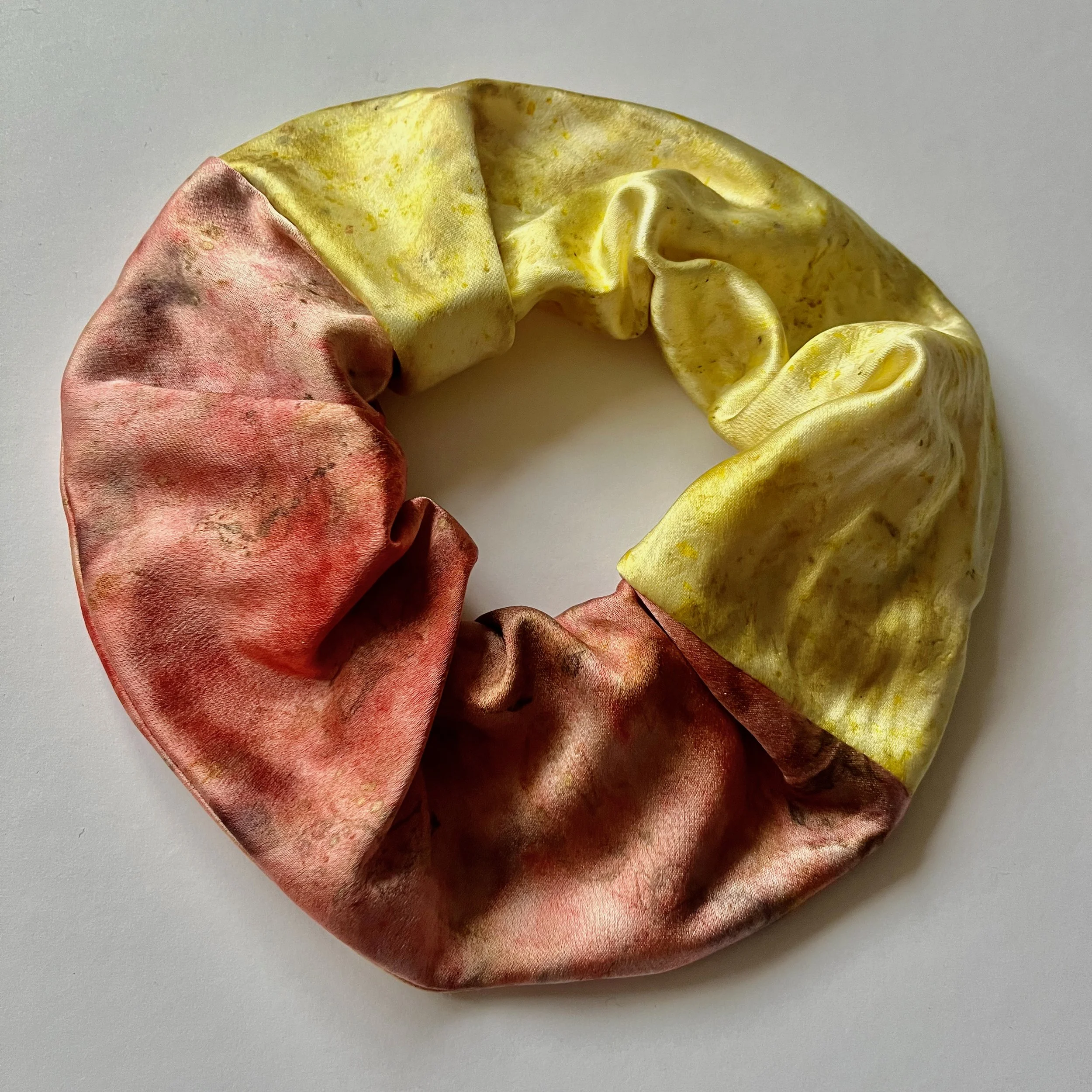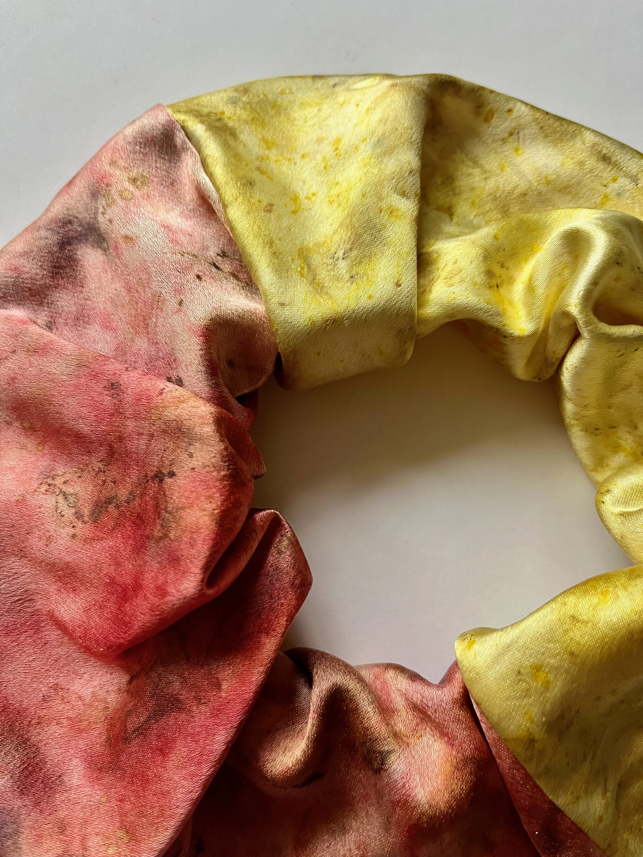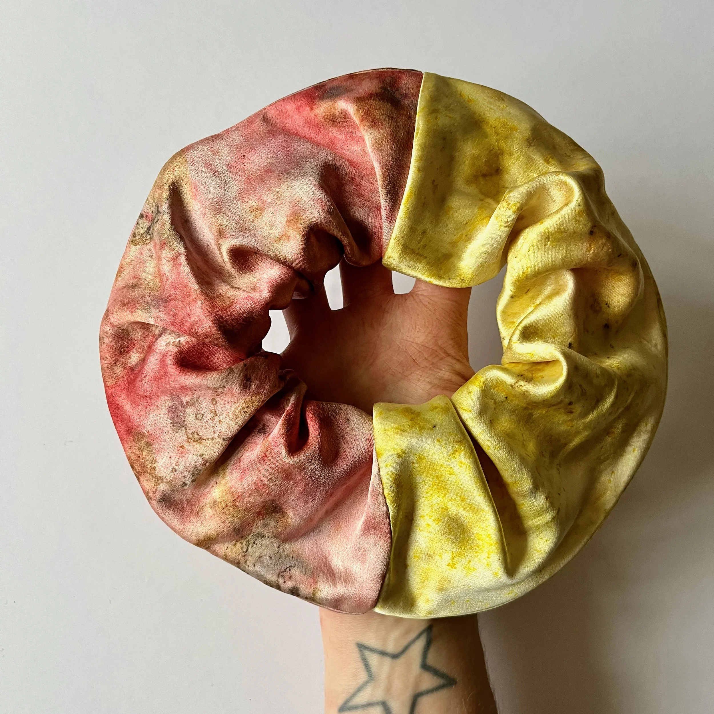 Each scrunchies uses two colourways. This one specifically has vibrant pink on one side, with refreshing yellow on the other side. Including such ingredients as, but not exclusive to: (pinks) madder powder, poppy, rose, hollyhock, common mallow / (purple) calendula, cosmos, turmeric, pomegranate, rosemary, iris.