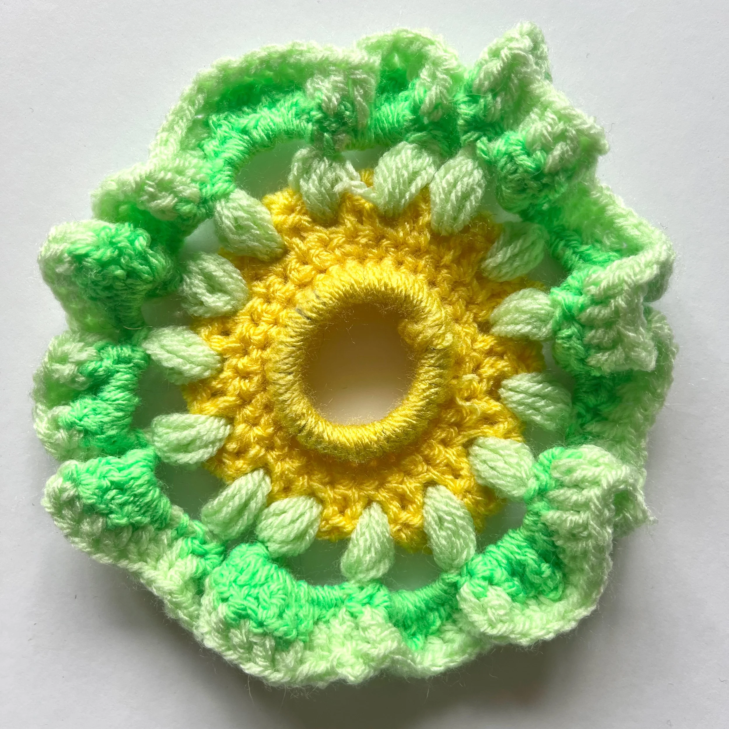 As with above, these crochet scrunchies were handmade by mum, while watching telly, to her own design. It does mean there are some “flaws” such as visible yarn ends or crude knots. However, the overall durability is good, and though scrunchies will get a lot of wear going on and off the head, they’ve been tested loads with lots of pulling.