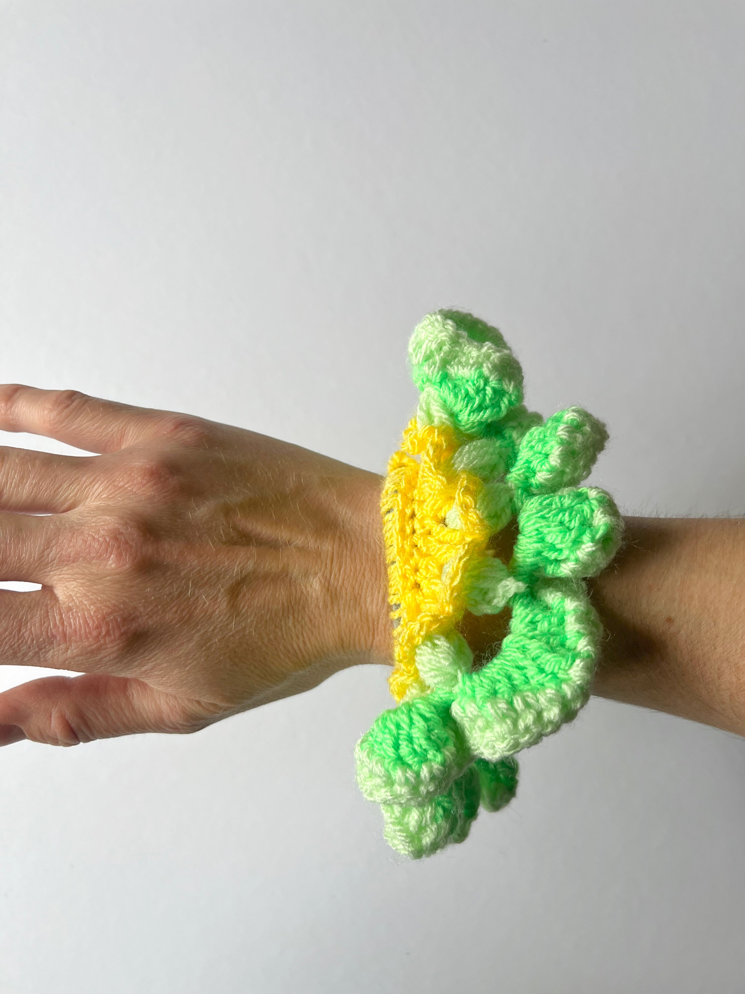 The photo showing the scrunchie around the wrist is to give guidance on the look of the item. Some of the crochet scrunchies have more layers/frills and so stand more upright.