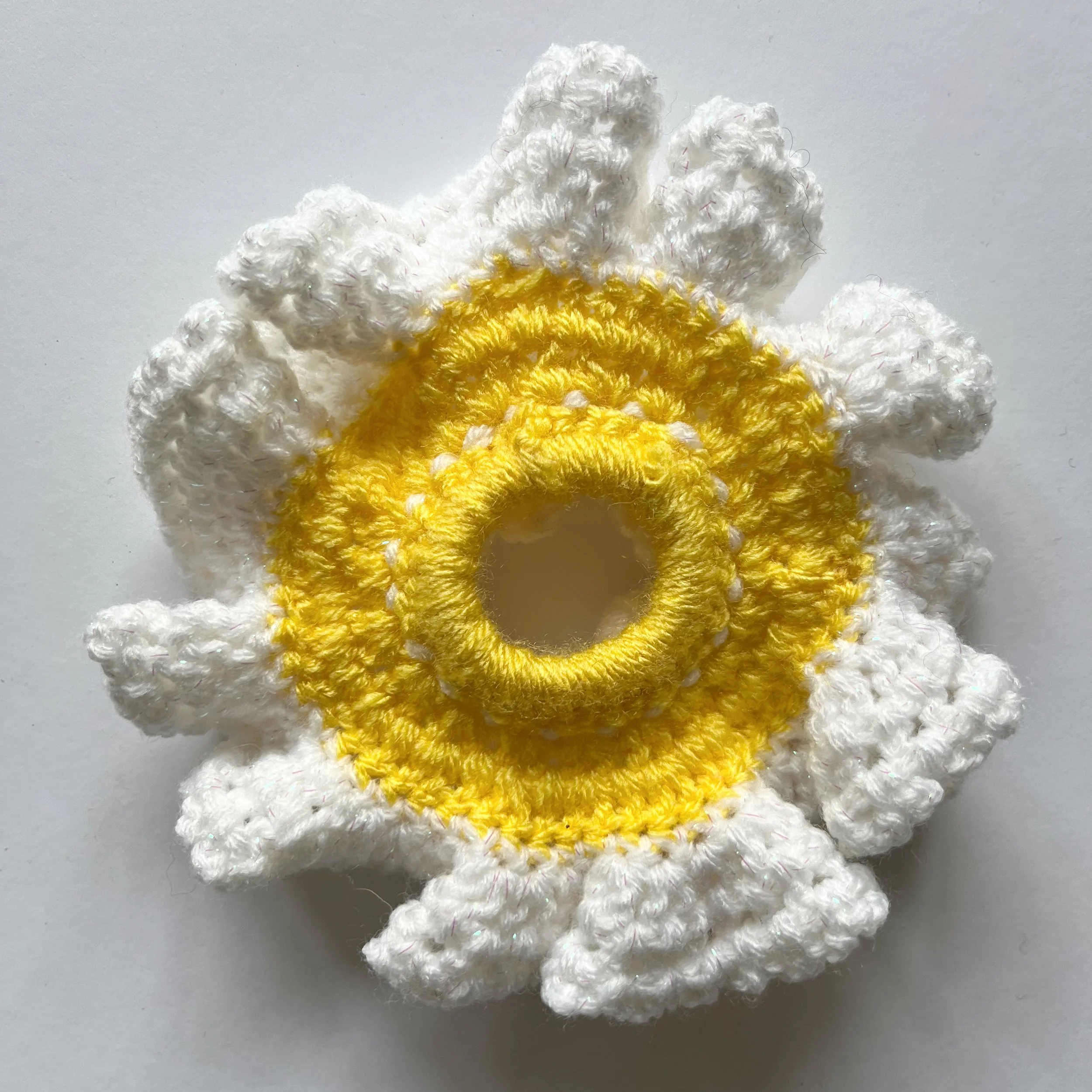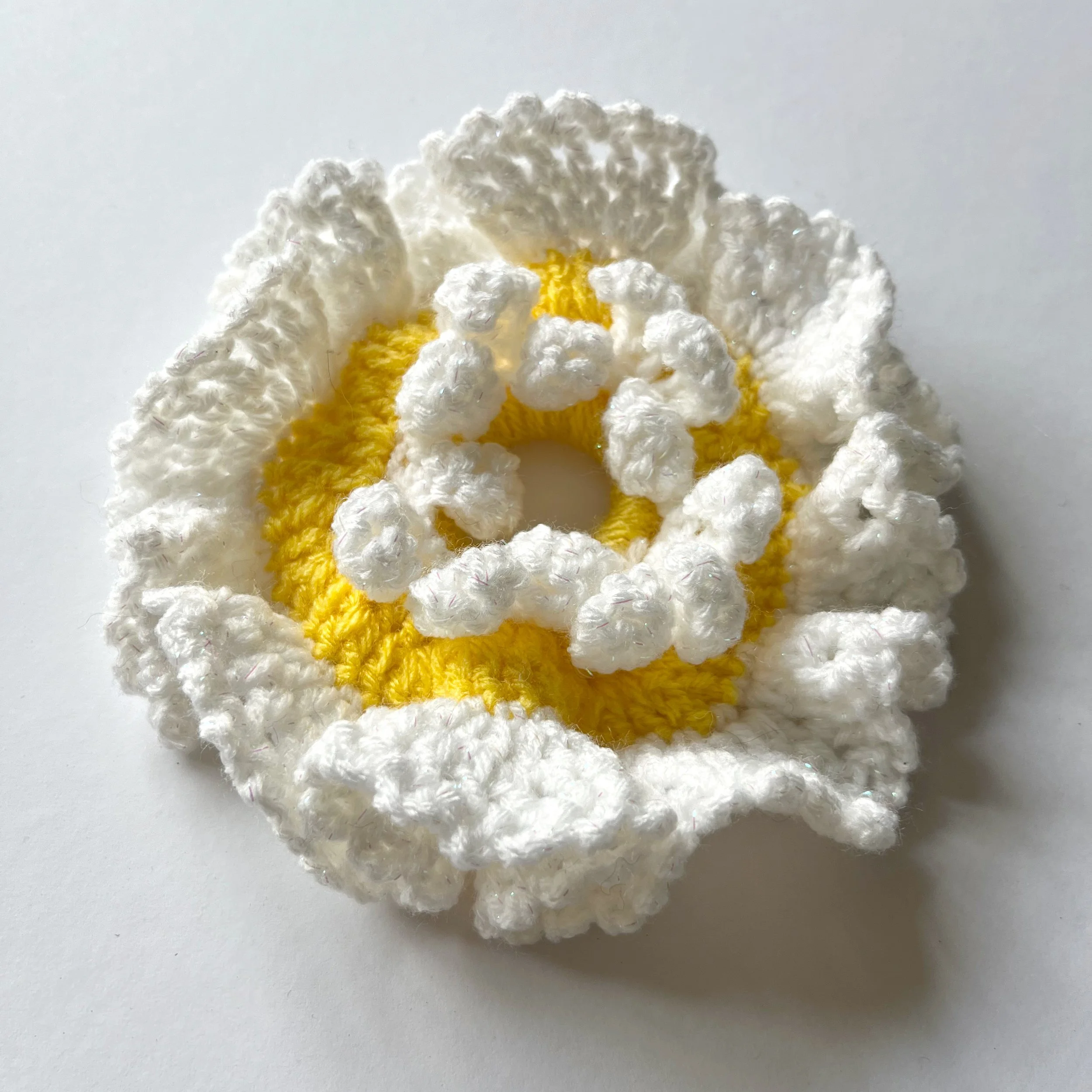 The crochet scrunchies are a classic medium size, and are generally wrapped around a bun/ponytail once or twice depending on the thickness of the hair. Unfortunately with this one, mum did some sort of lock stitch so the elastic band doesn’t stretch fully! Instead, put it on over your bun/ponytail and leave in place.