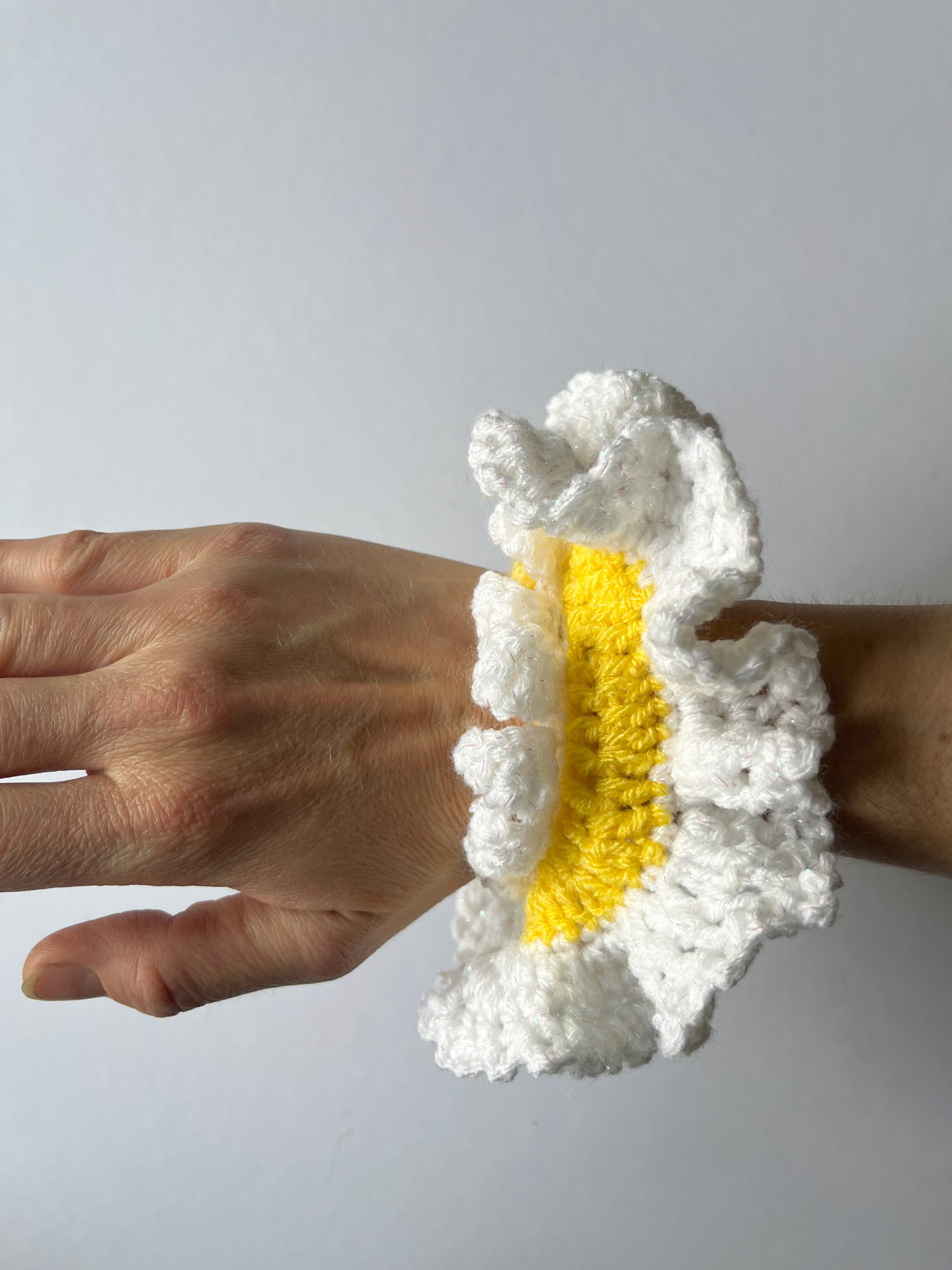 The photo showing the scrunchie around the wrist is to give guidance on the look of the item. Some of the crochet scrunchies have more layers/frills and so stand more upright.