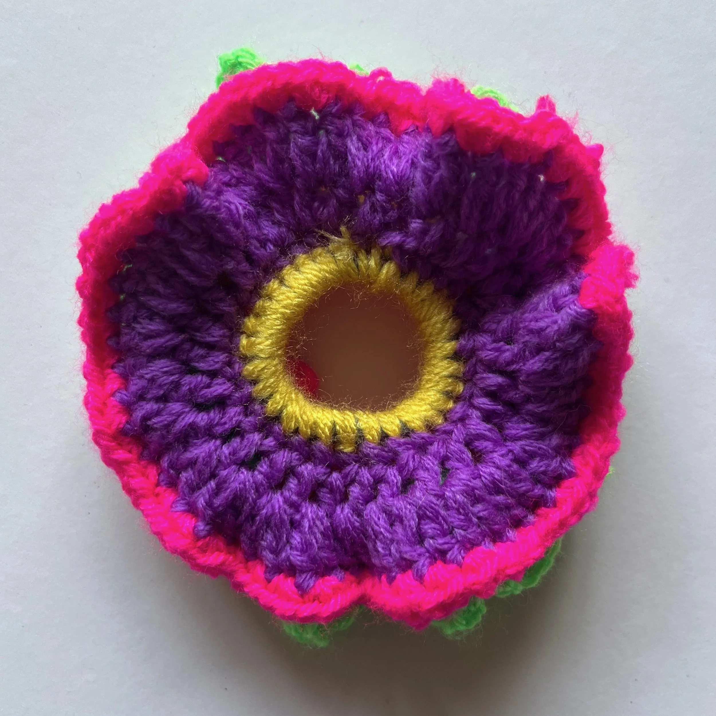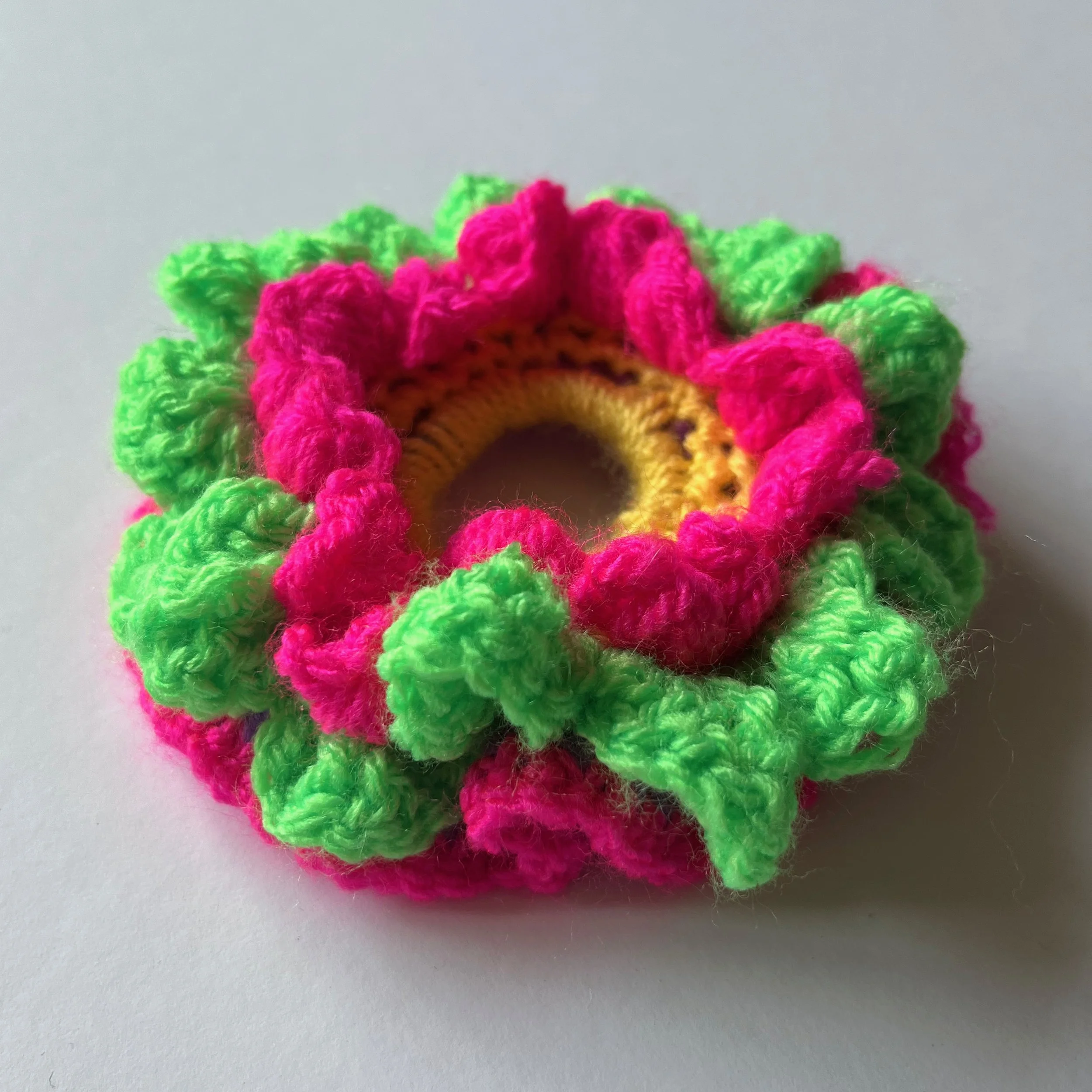 As with above, these crochet scrunchies were handmade by mum, while watching telly, to her own design. It does mean there could be some “flaws” such as visible yarn ends or crude knots. However, the overall durability is good, and though scrunchies will get a lot of wear going on and off the head, they’ve been tested loads with lots of pulling.