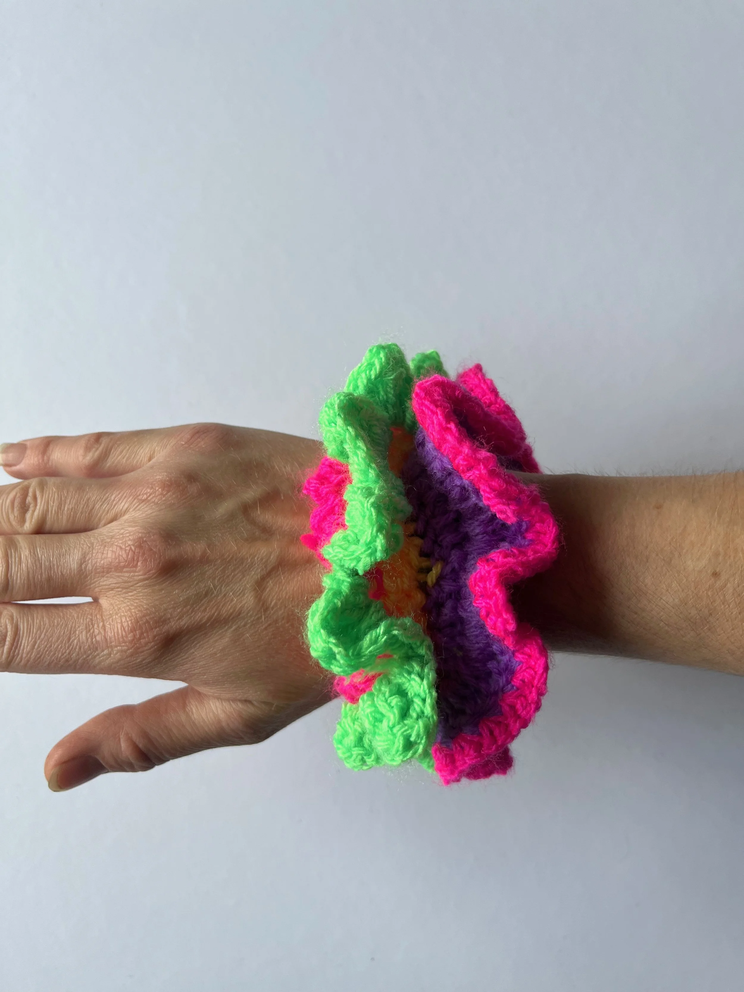 The photo showing the scrunchie around the wrist is to give guidance on the look of the item. Some of the crochet scrunchies have more layers/frills and so stand more upright.