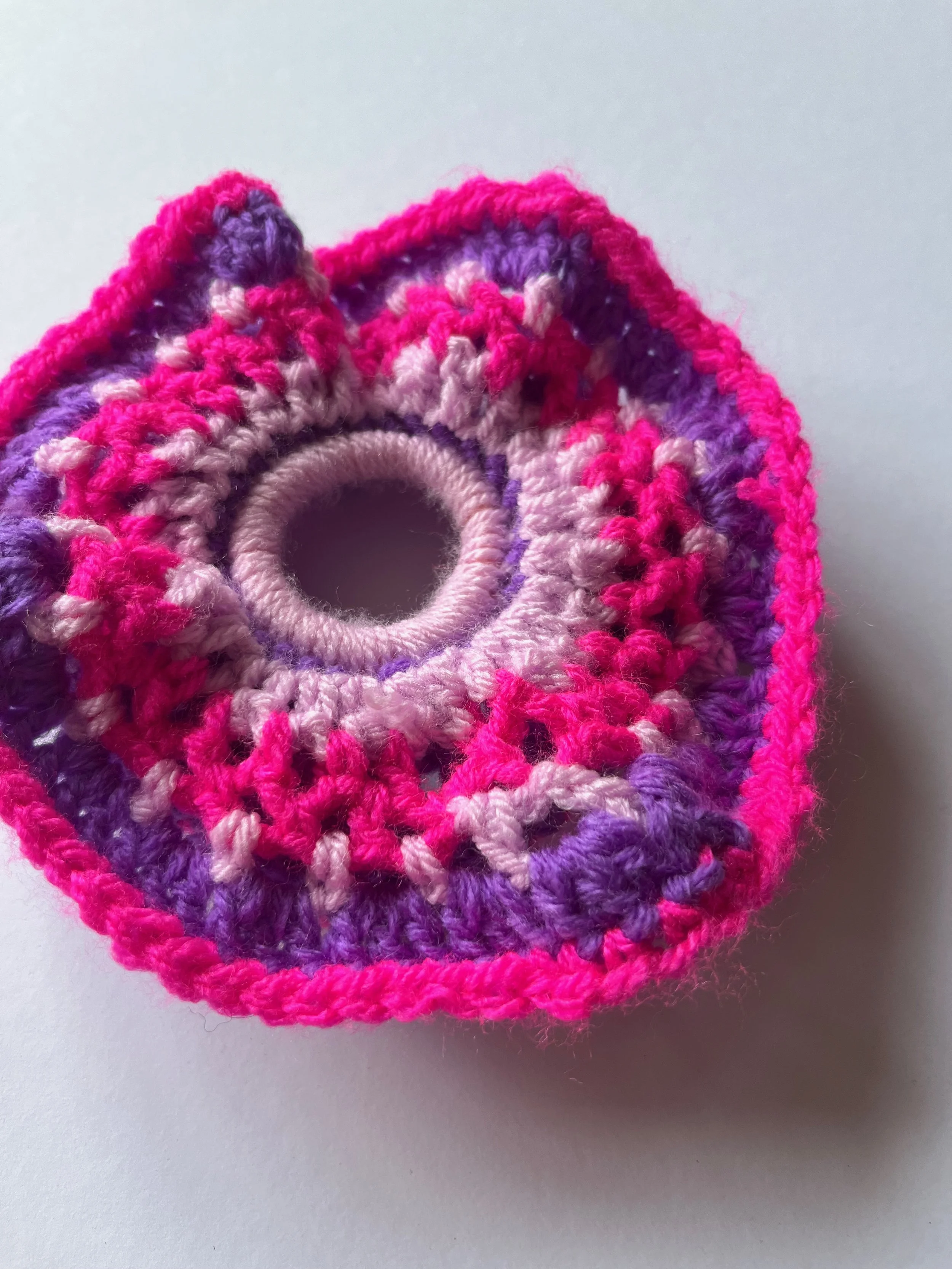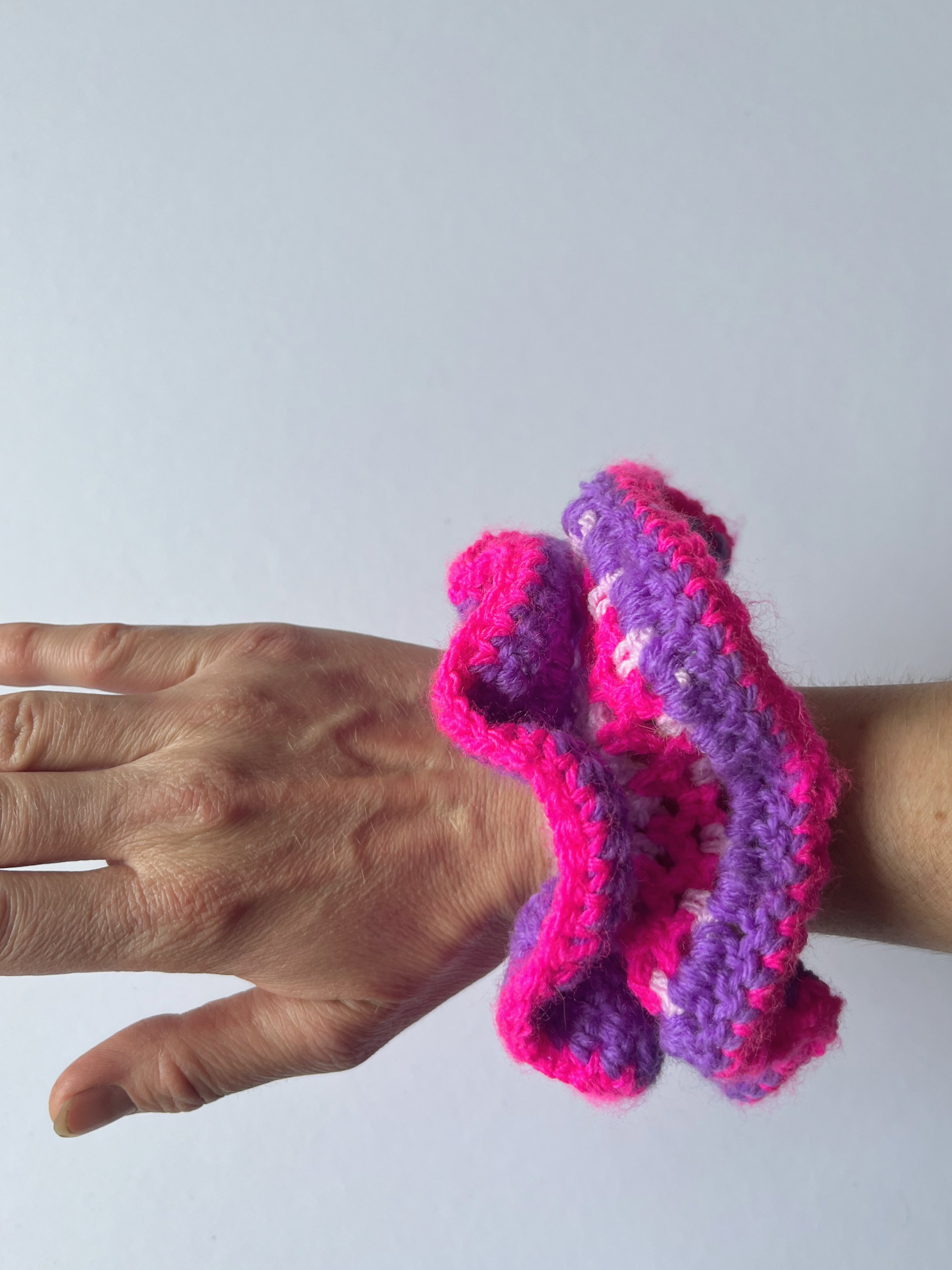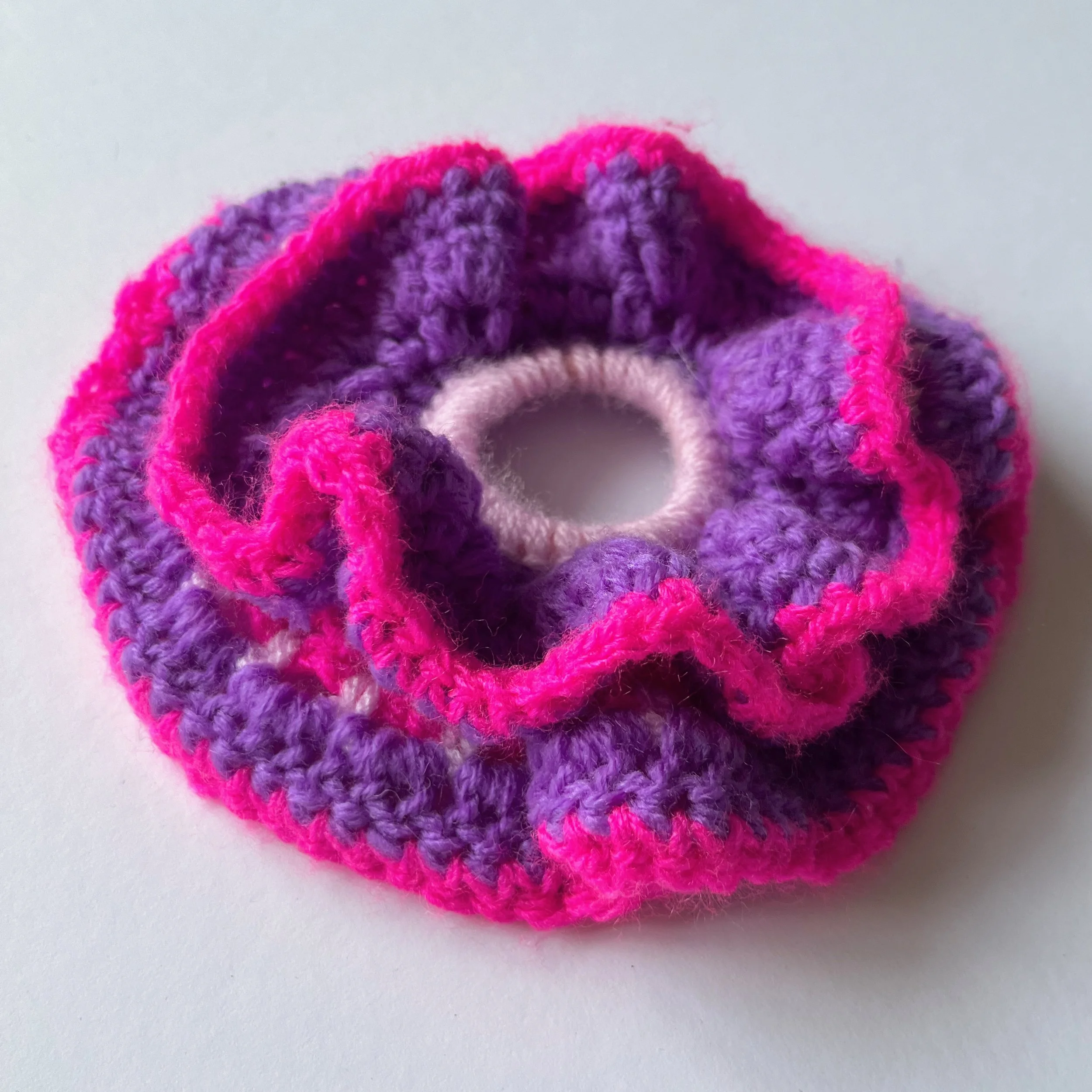As with above, these crochet scrunchies were handmade by mum, while watching telly, to her own design. It does mean there could be some “flaws” such as visible yarn ends or crude knots (with this one you see purple on the join with pink). However, the overall durability is good, and though scrunchies will get a lot of wear going on and off the head, they’ve been tested loads with lots of pulling.
