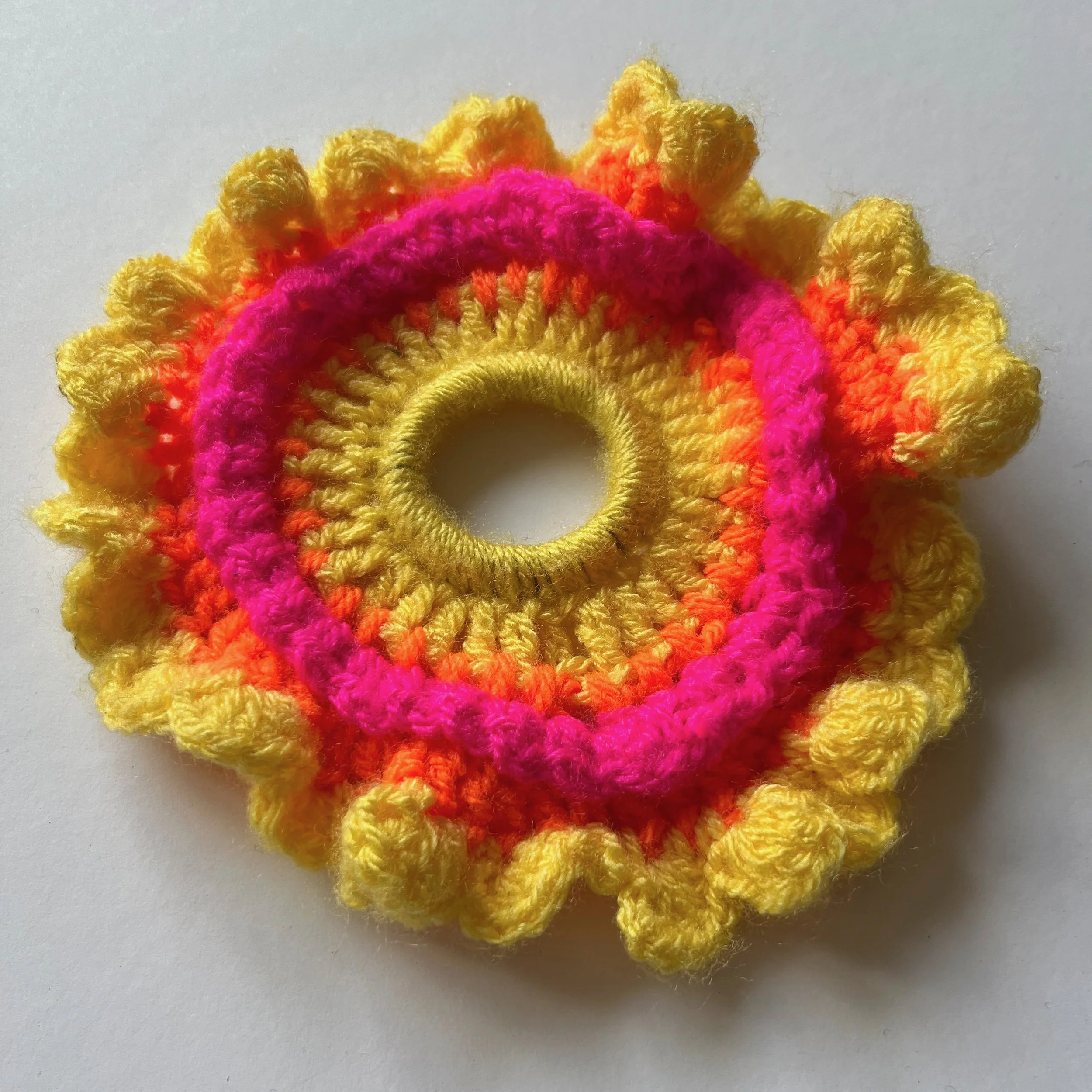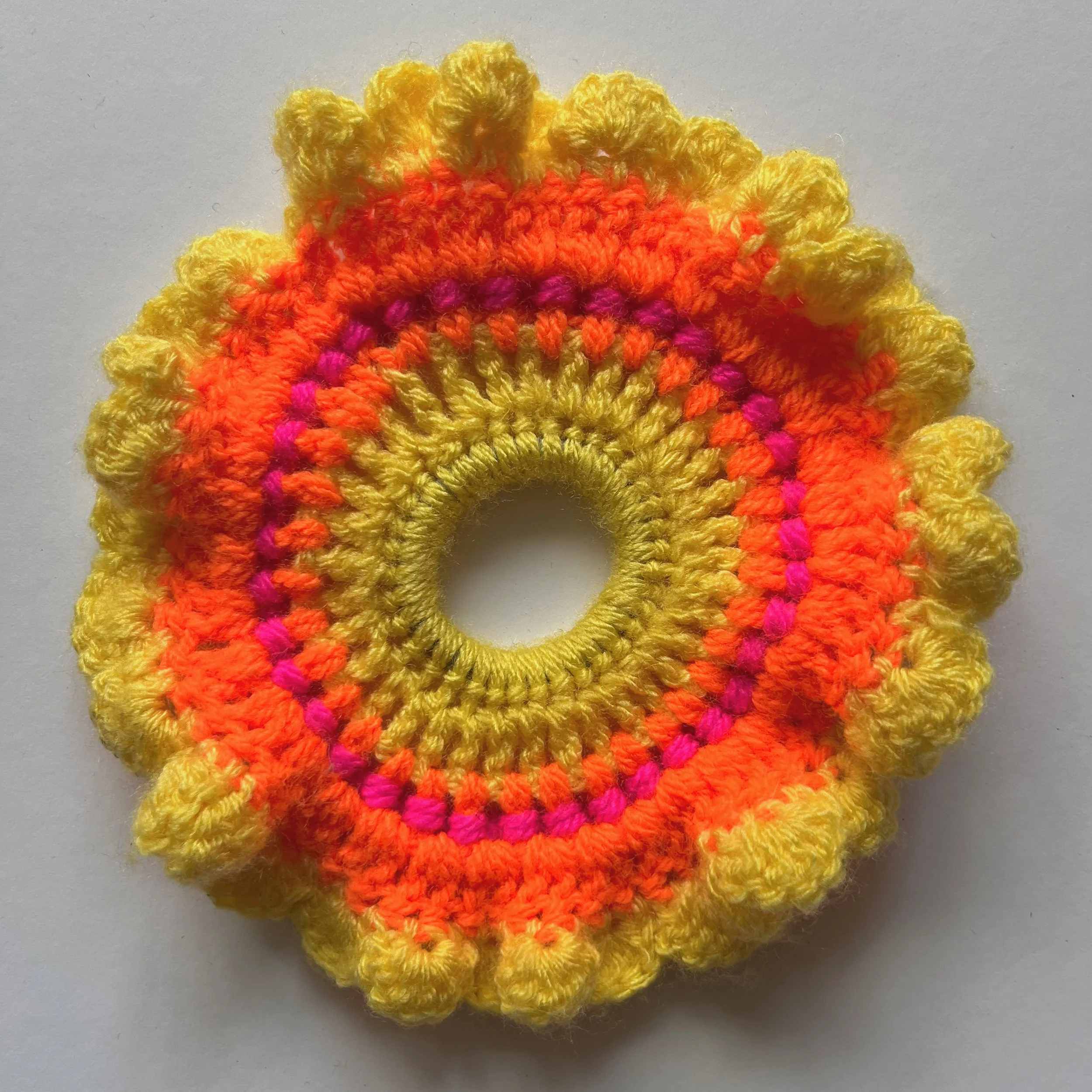 As with above, these crochet scrunchies were handmade by mum, while watching telly, to her own design. It does mean there are some “flaws” such as visible yarn ends or crude knots. However, the overall durability is good, and though scrunchies will get a lot of wear going on and off the head, they’ve been tested loads with lots of pulling.