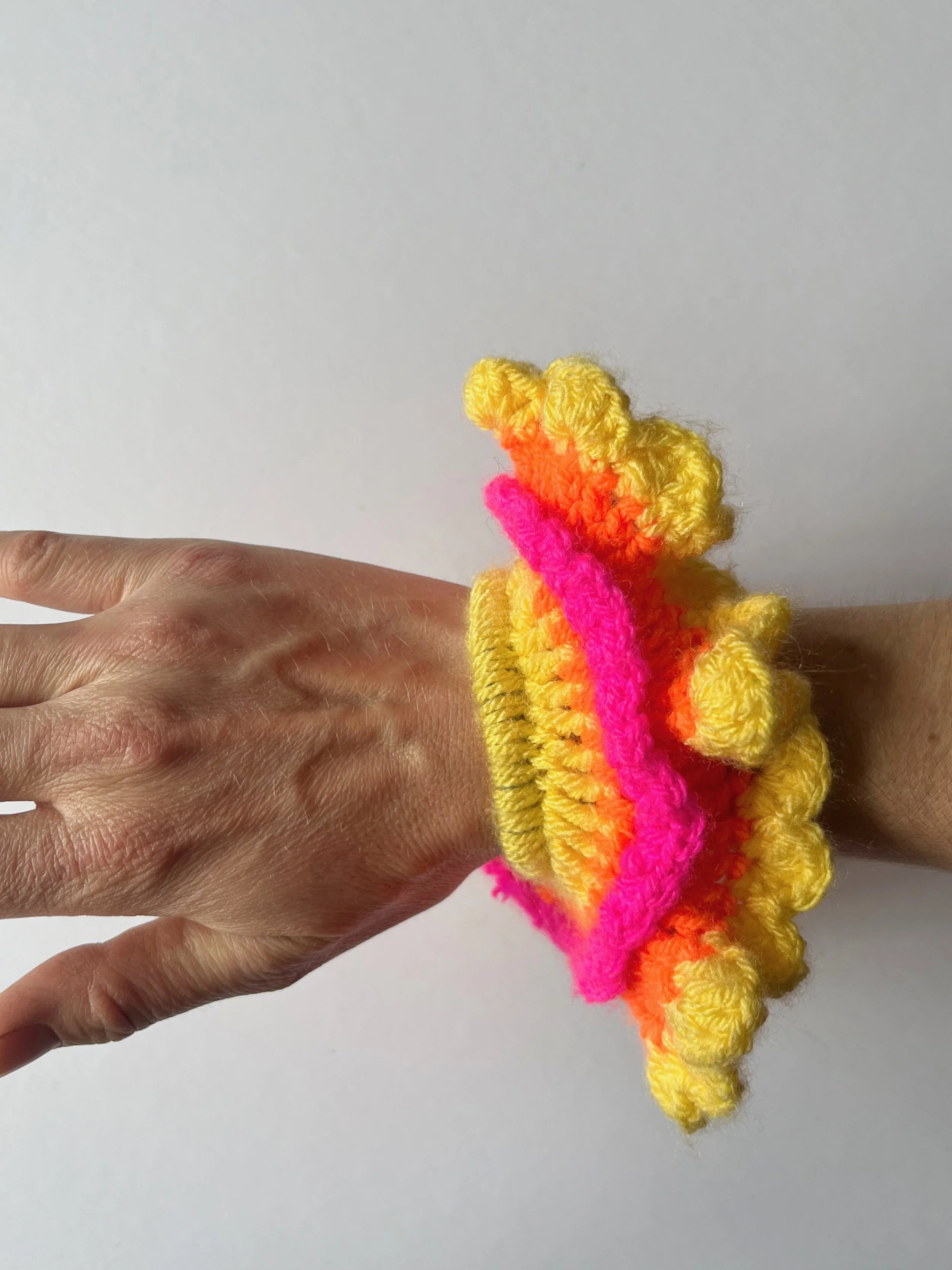 The photo showing the scrunchie around the wrist is to give guidance on the look of the item. Some of the crochet scrunchies have more layers/frills and so stand more upright.
