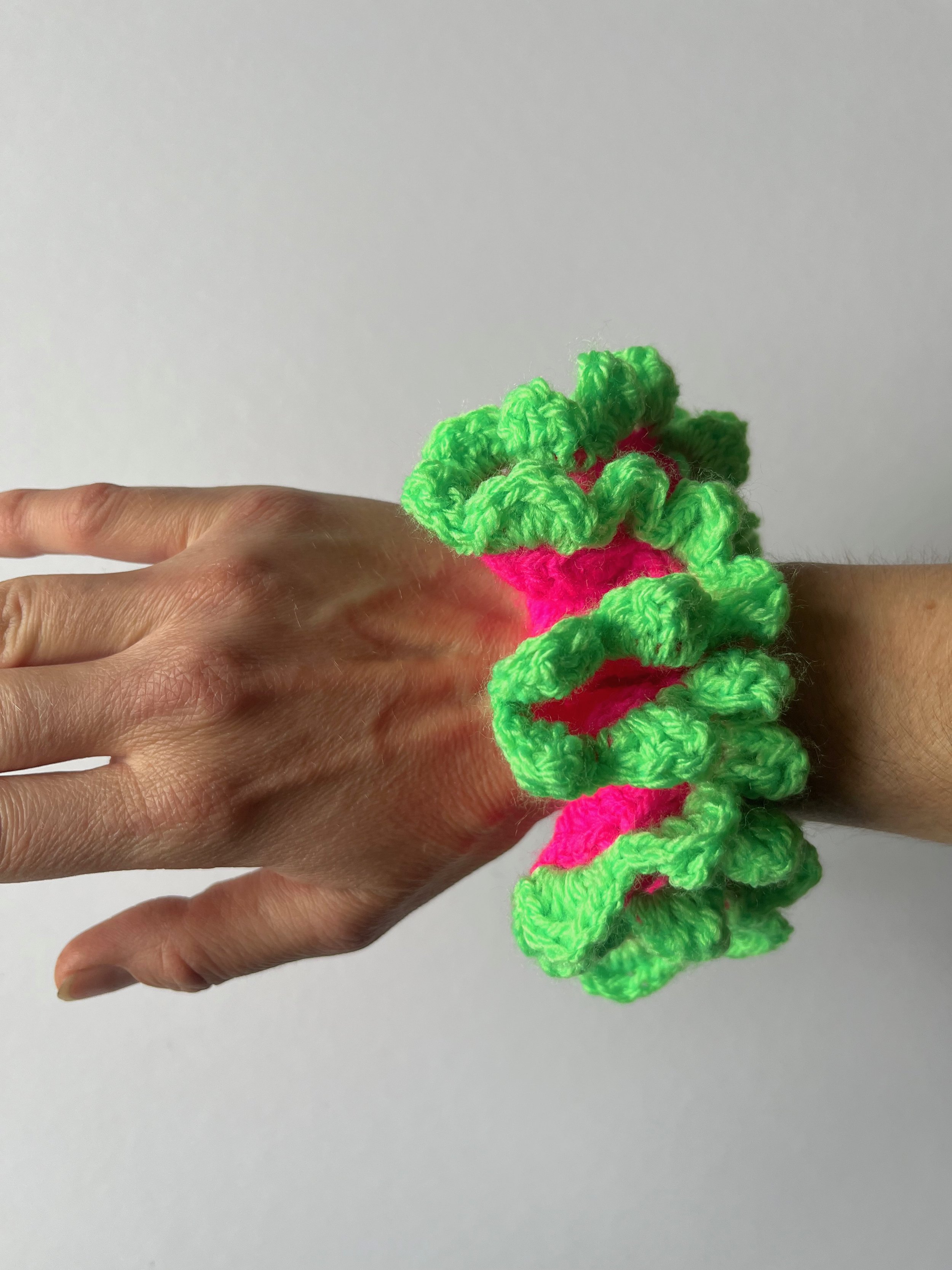 The photo showing the scrunchie around the wrist is to give guidance on the look of the item. Some of the crochet scrunchies have more layers/frills and so stand more upright.