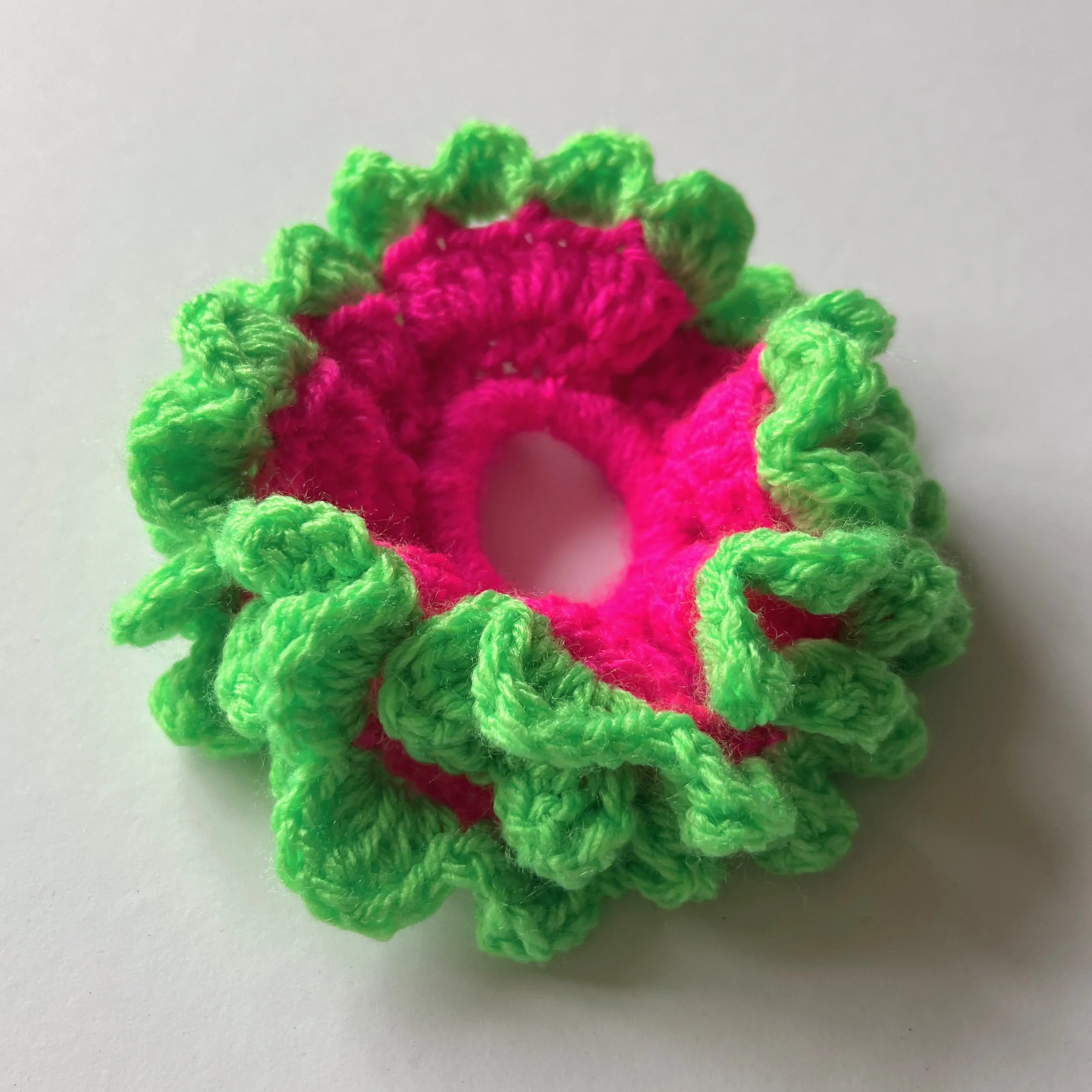 As with above, these crochet scrunchies were handmade by mum, while watching telly, to her own design. It does mean there are some “flaws” such as visible yarn ends or crude knots. However, the overall durability is good, and though scrunchies will get a lot of wear going on and off the head, they’ve been tested loads with lots of pulling.