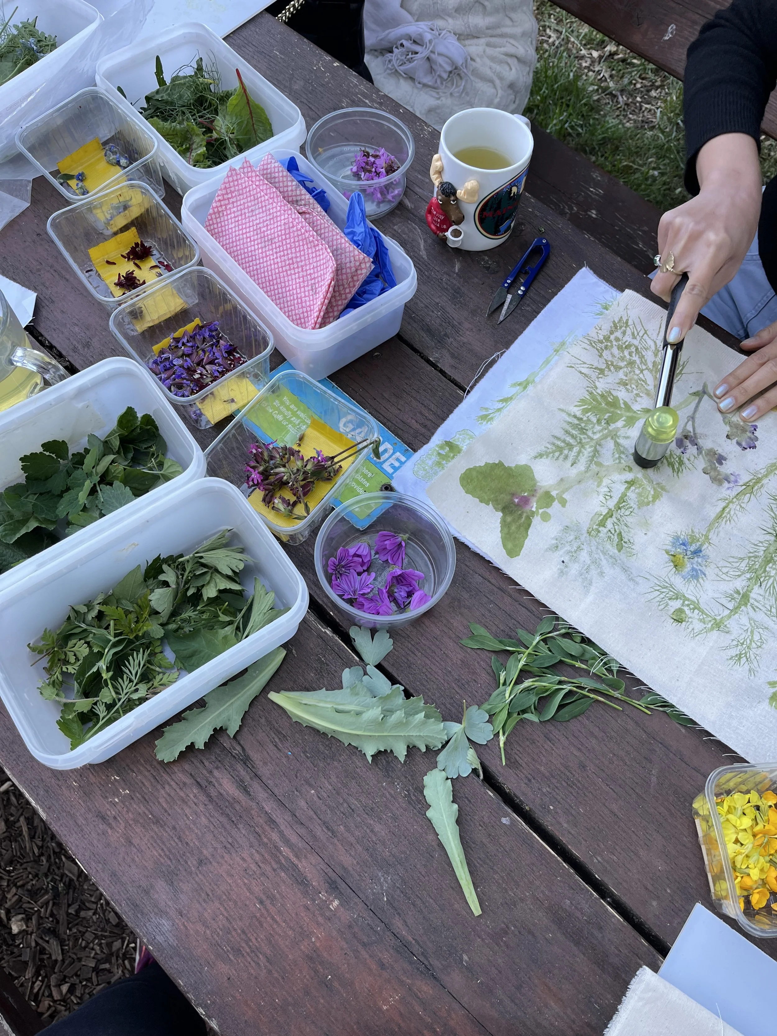 This three-hour guided workshop will take you on an introductory foraging walk of seasonal plants in a permaculture garden setting, and instruct you in the practice of making prints via two techniques onto textiles using plants, flowers, food waste and metal.